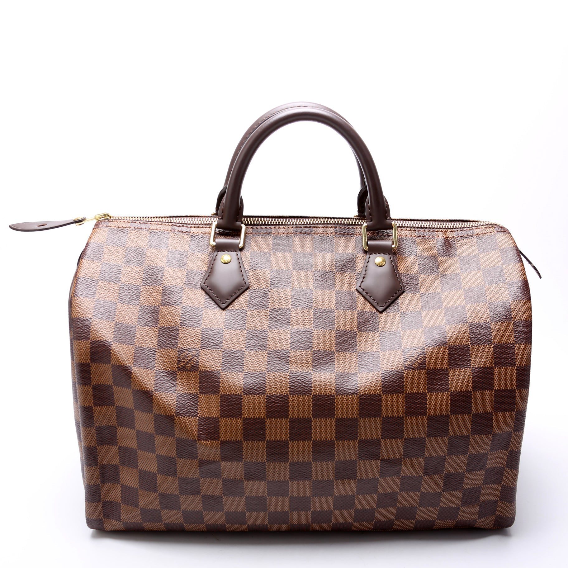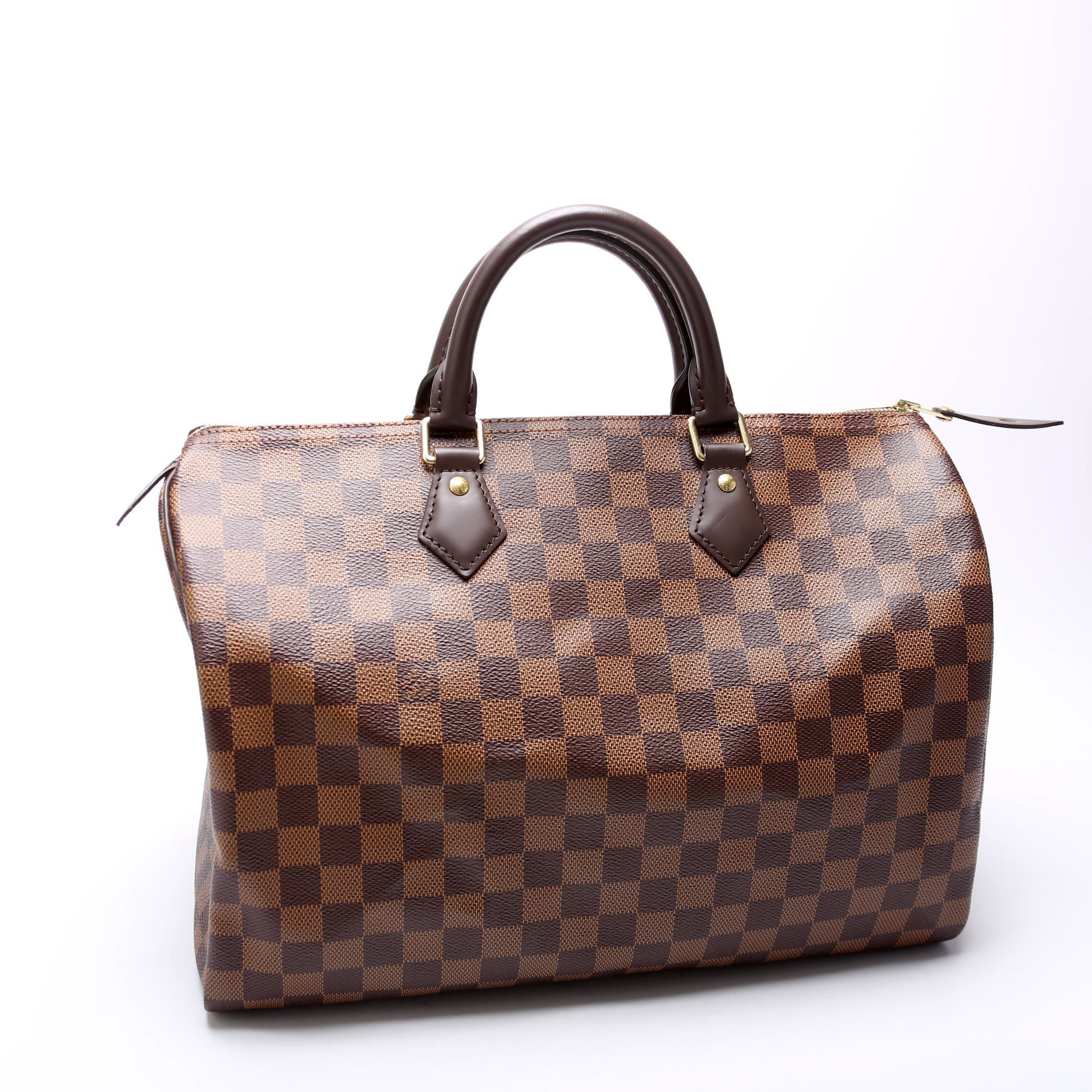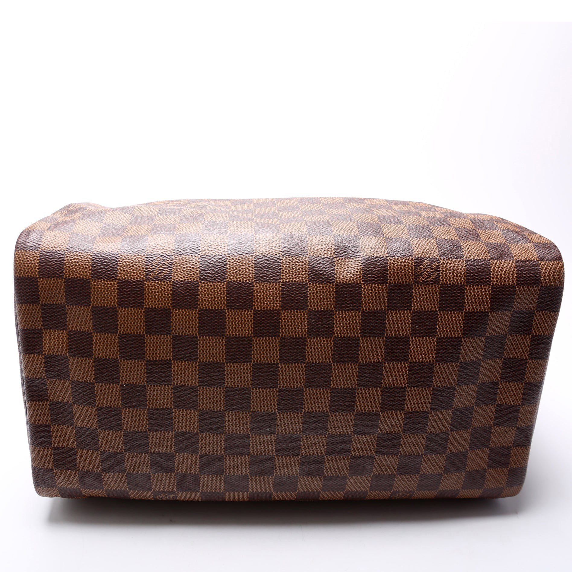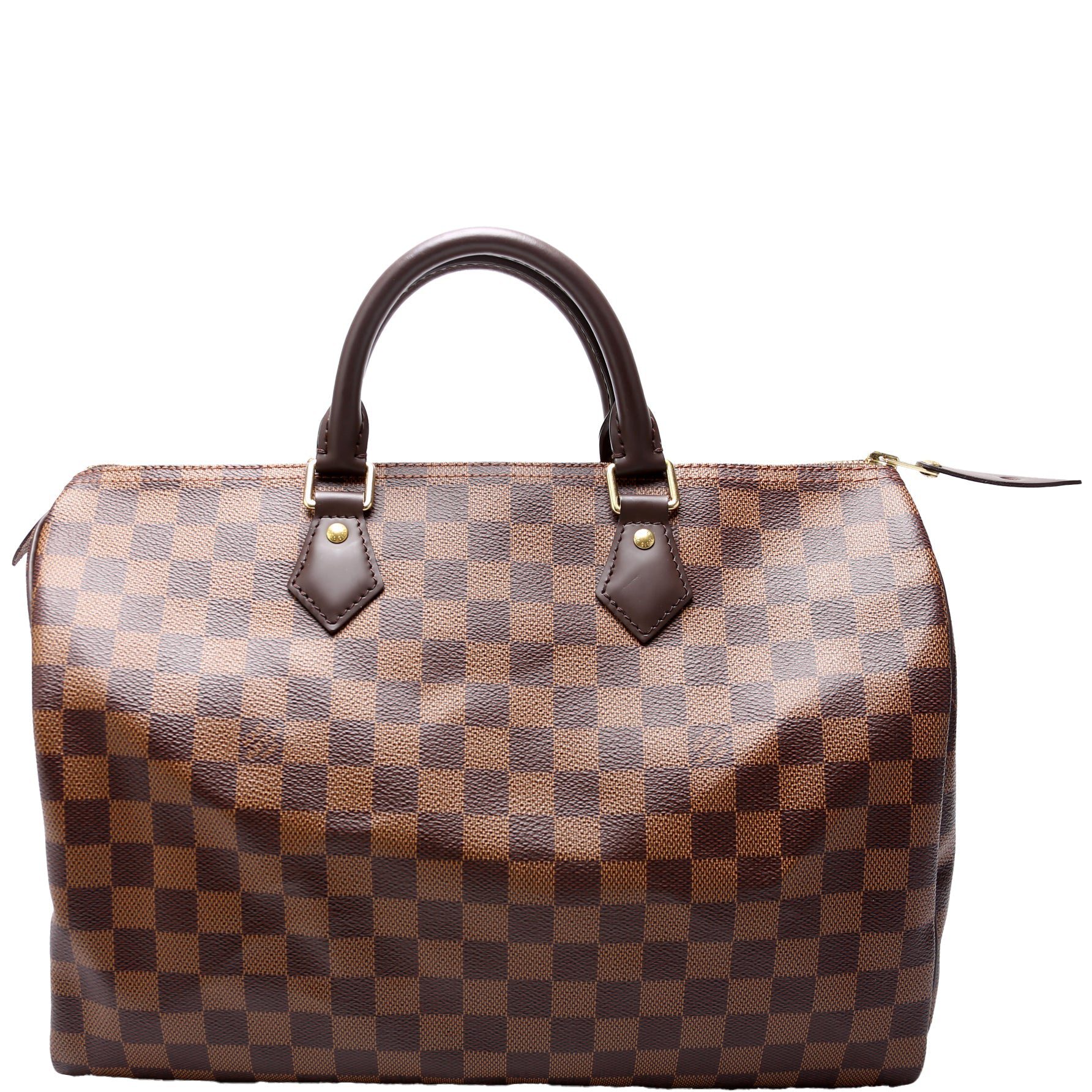 Louis Vuitton Speedy 35. The exterior is in the classic Louis Vuitton Damier Ebene coated canvas.