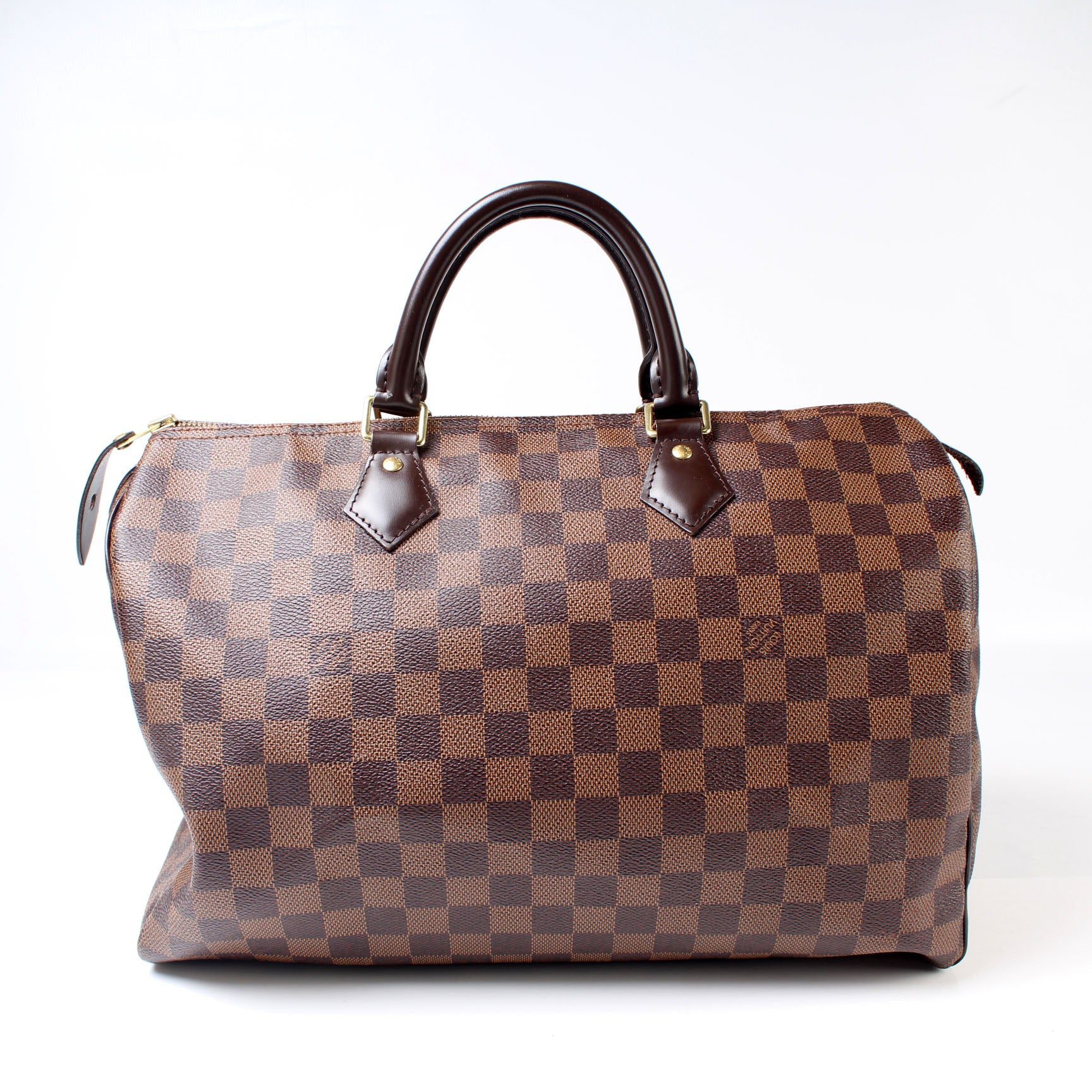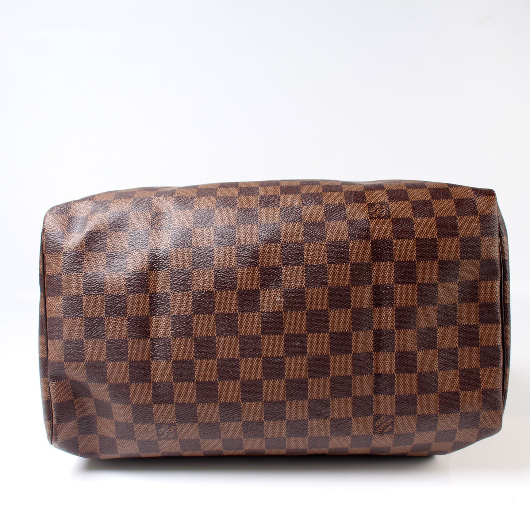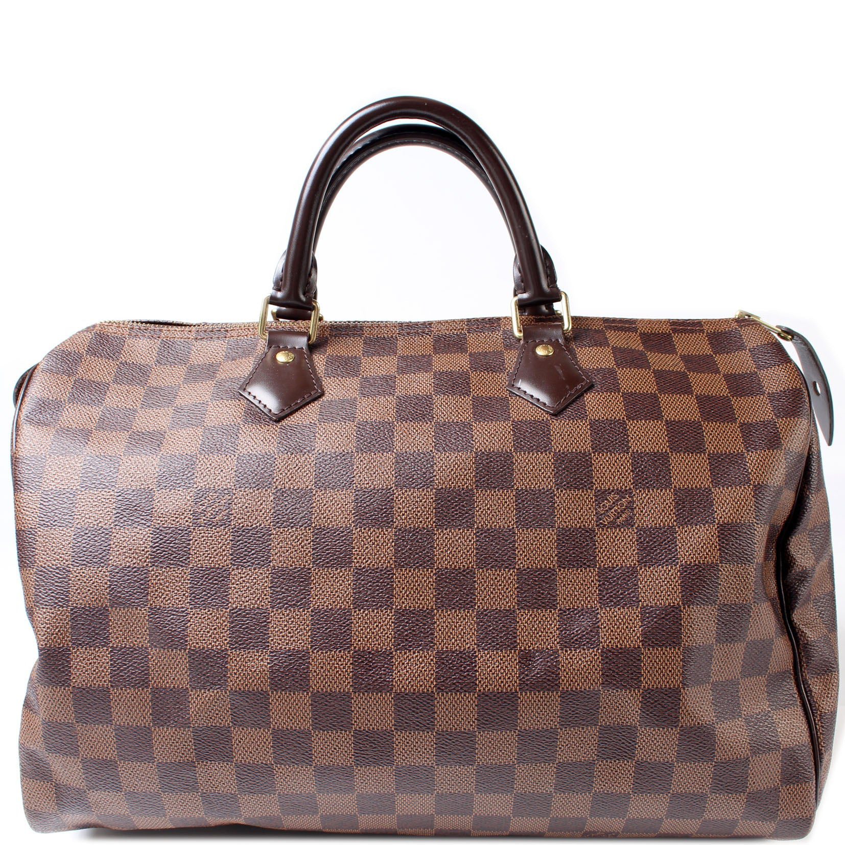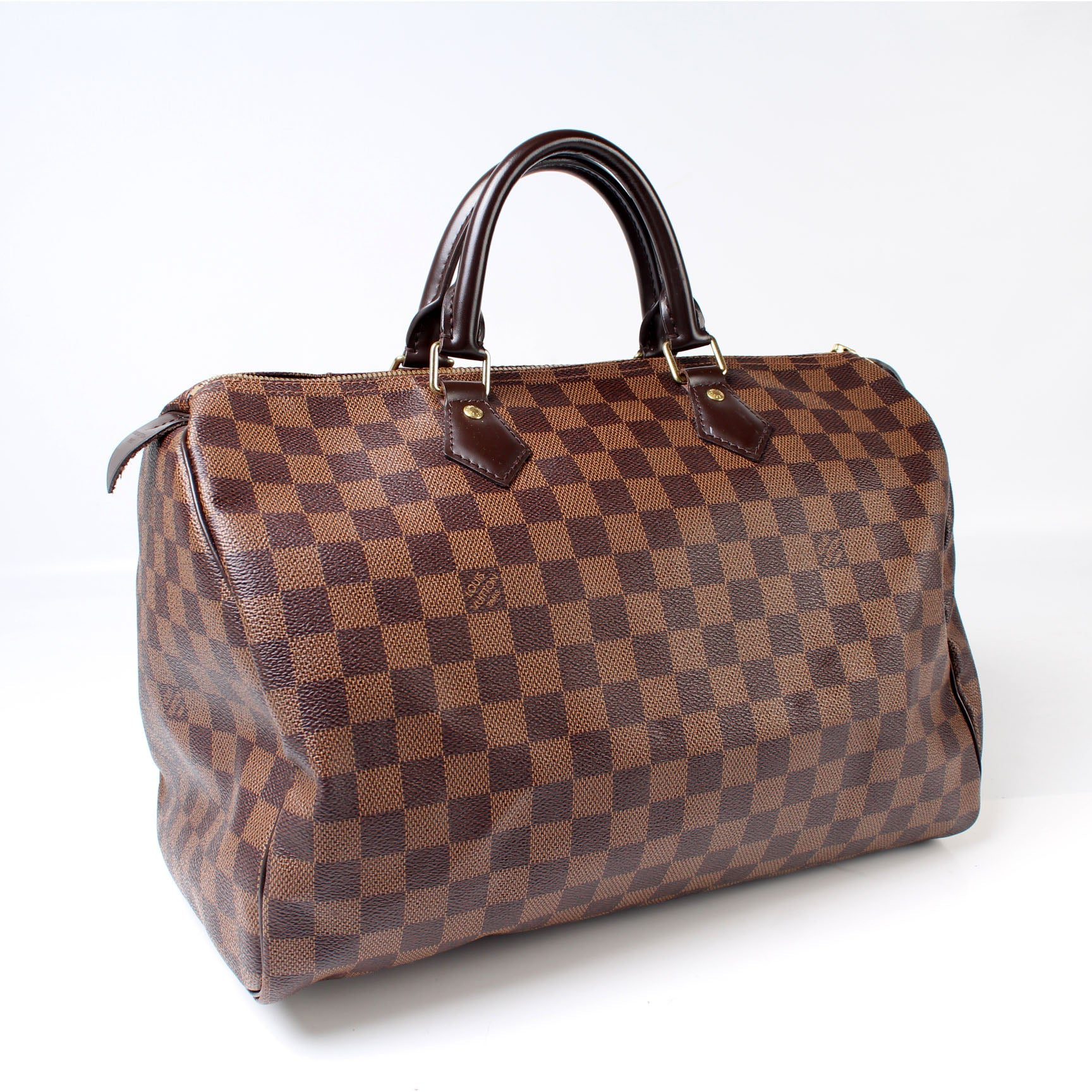 Louis Vuitton Speedy 35. The exterior is in the classic Louis Vuitton Damier Ebene coated canvas.Â