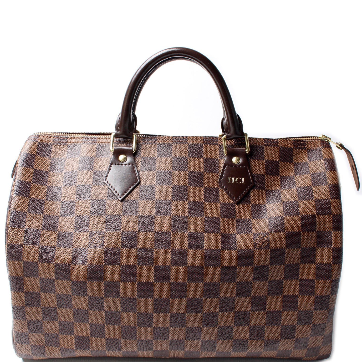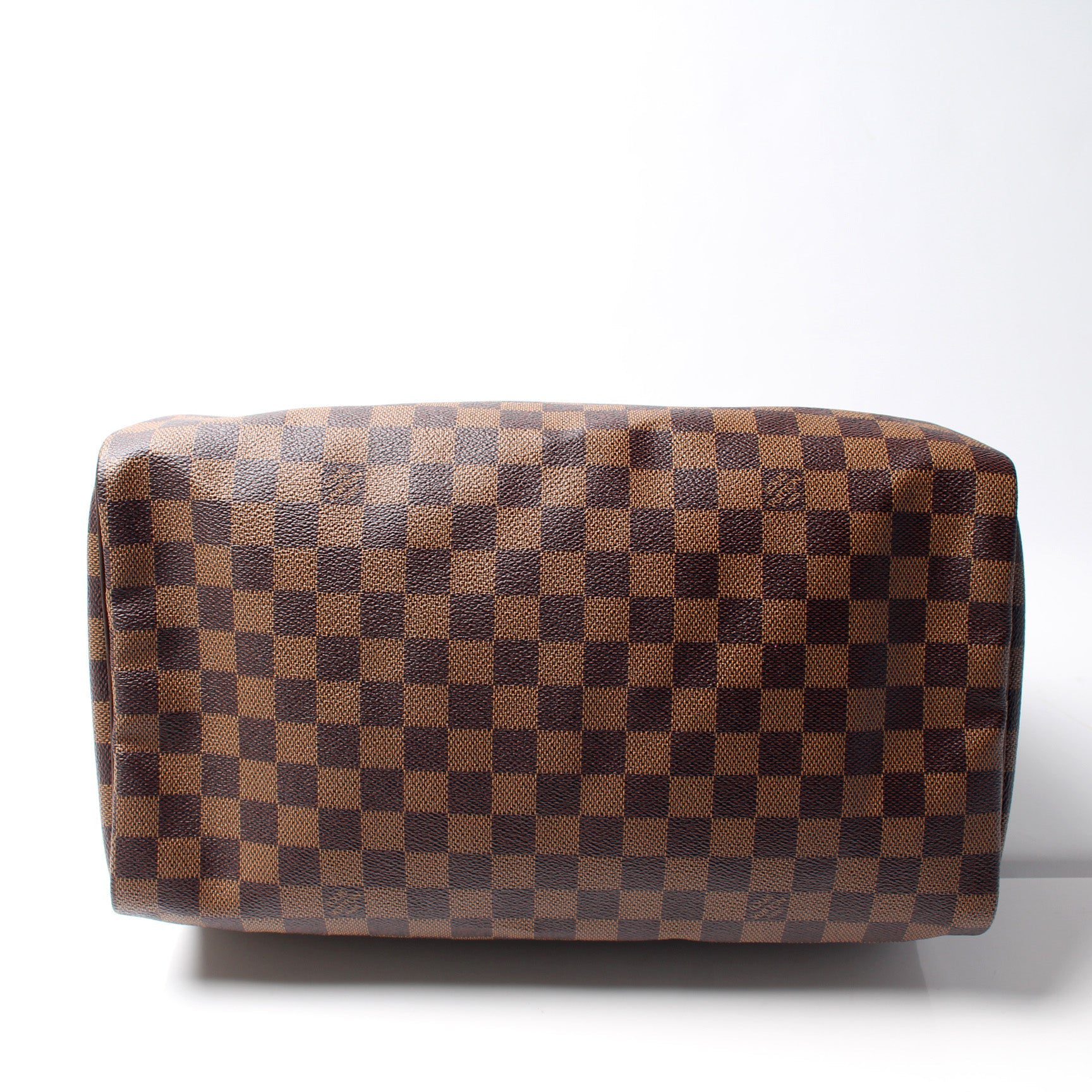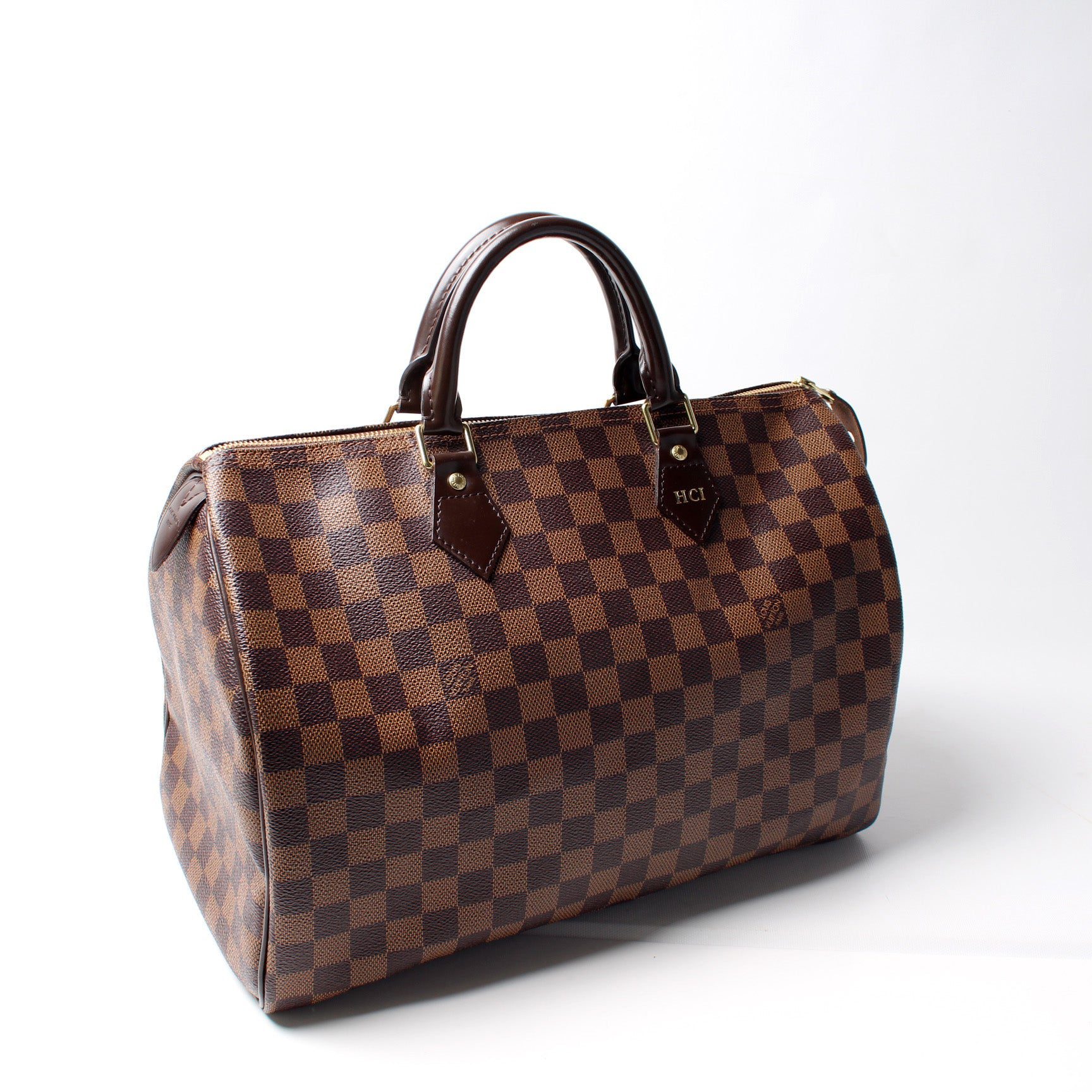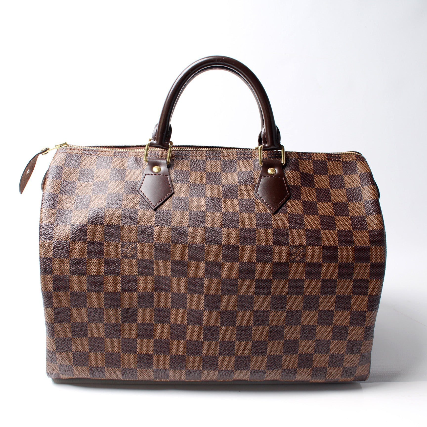 Louis Vuitton Speedy 35. The exterior is in the classic Louis Vuitton Damier Ebene coated canvas.Â