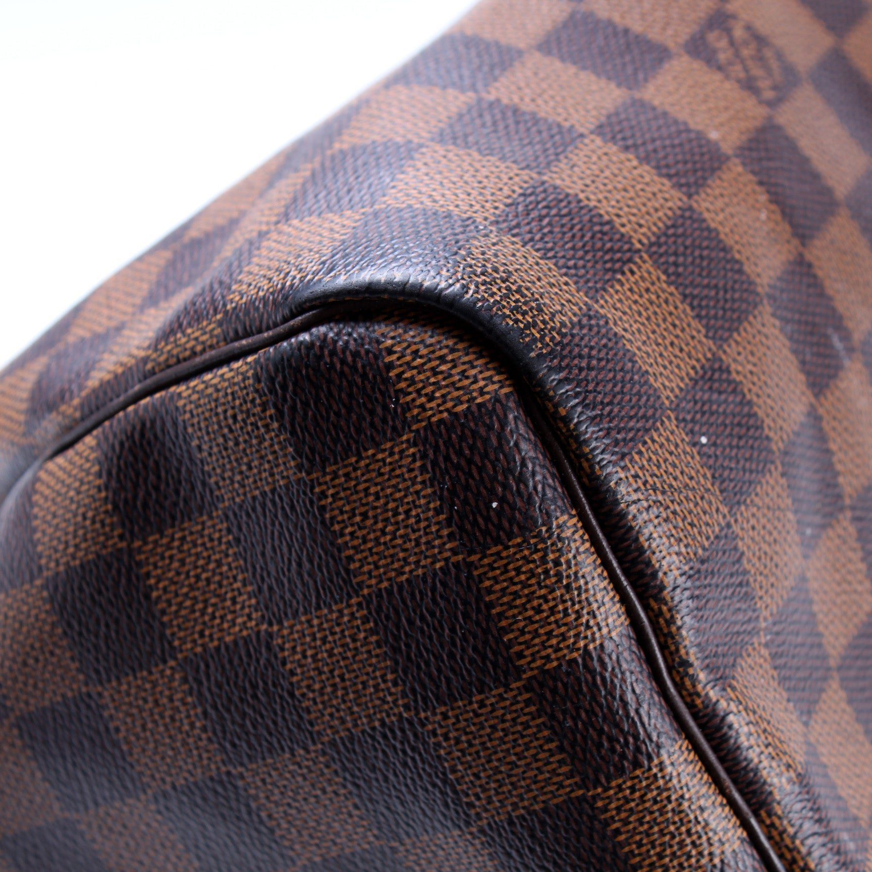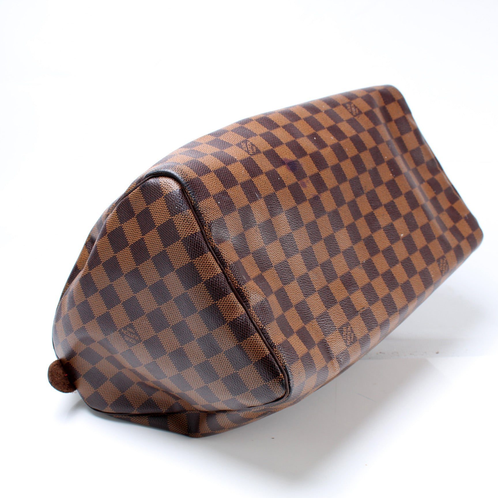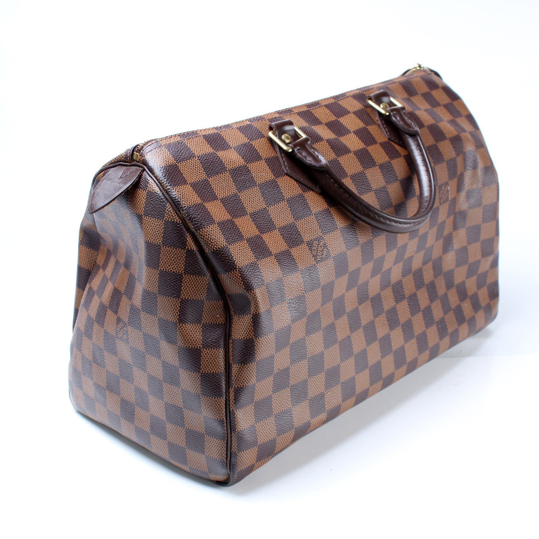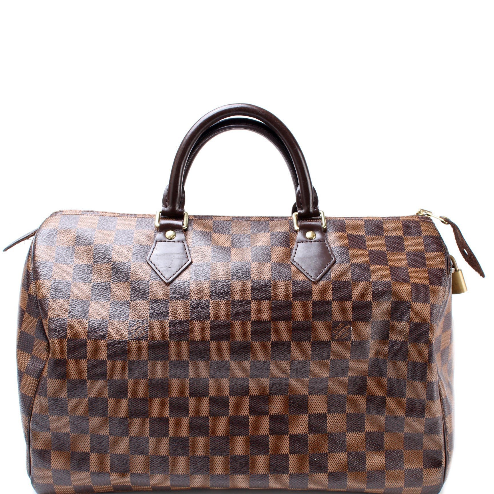 Louis Vuitton Speedy 35. The exterior is in the classic Louis Vuitton Damier Ebene coated canvas.Â