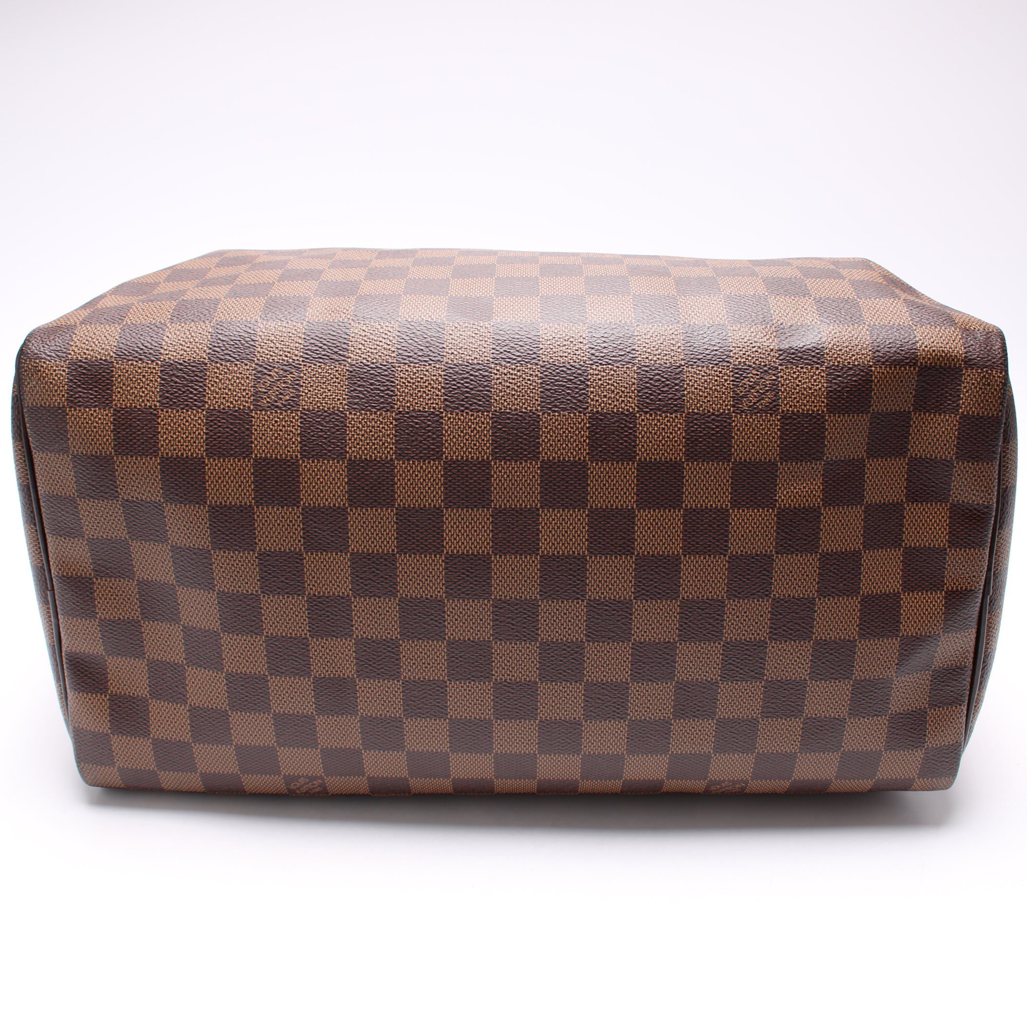 Louis Vuitton Speedy 35. The exterior is in the classic Louis Vuitton Damier Ebene coated canvas.