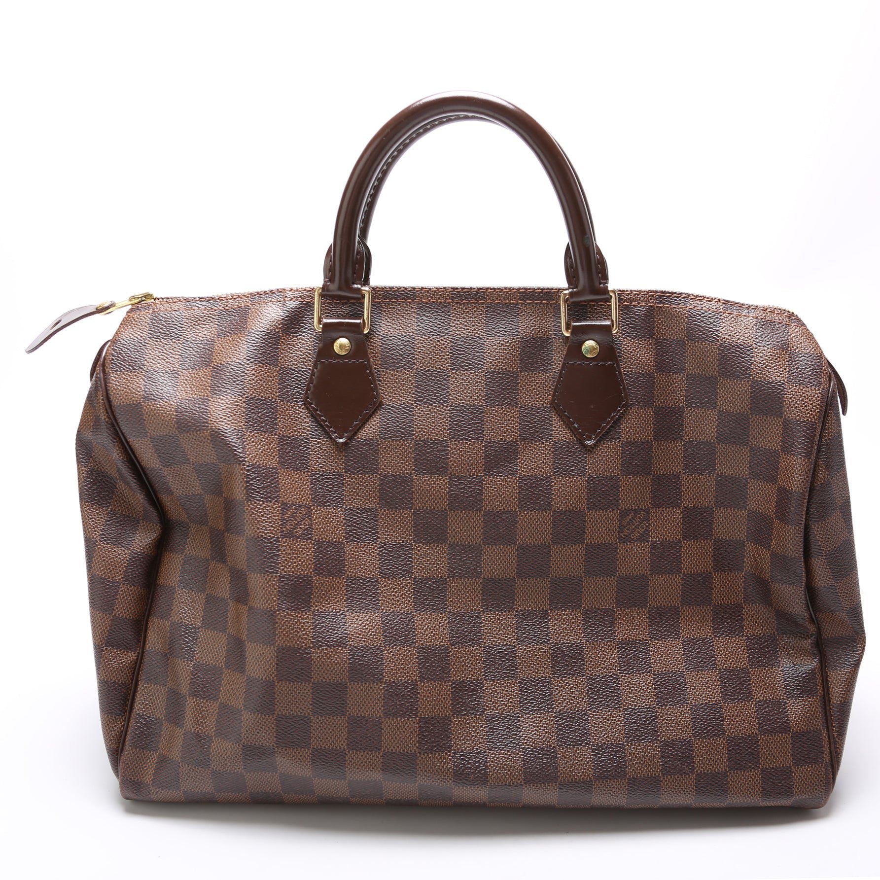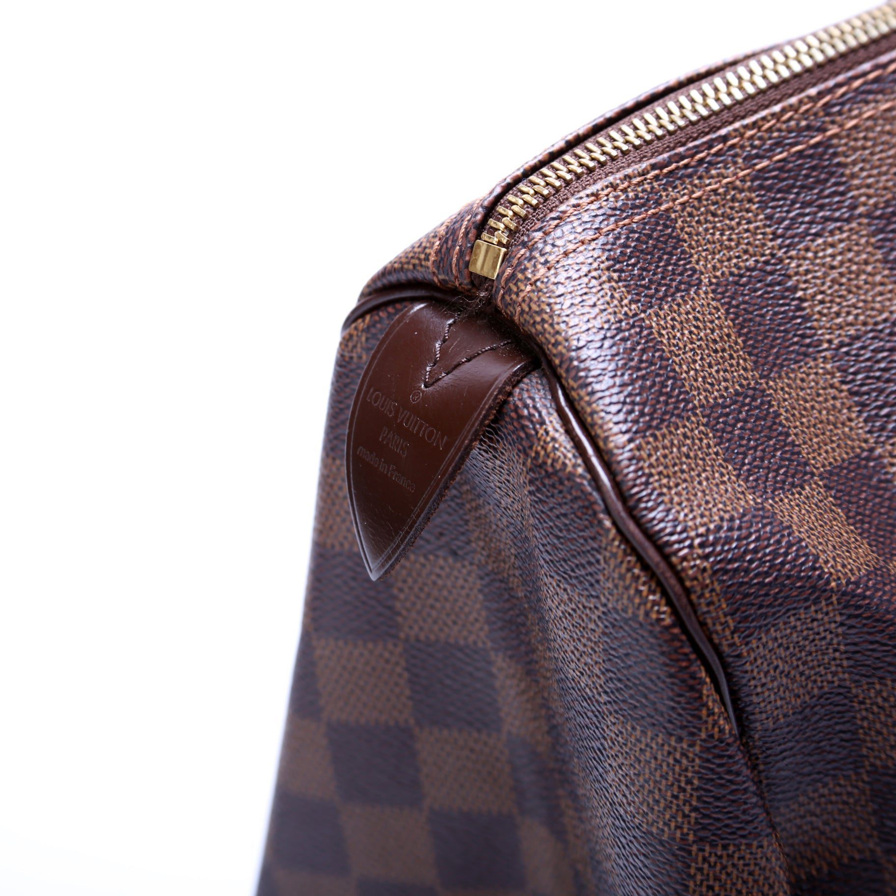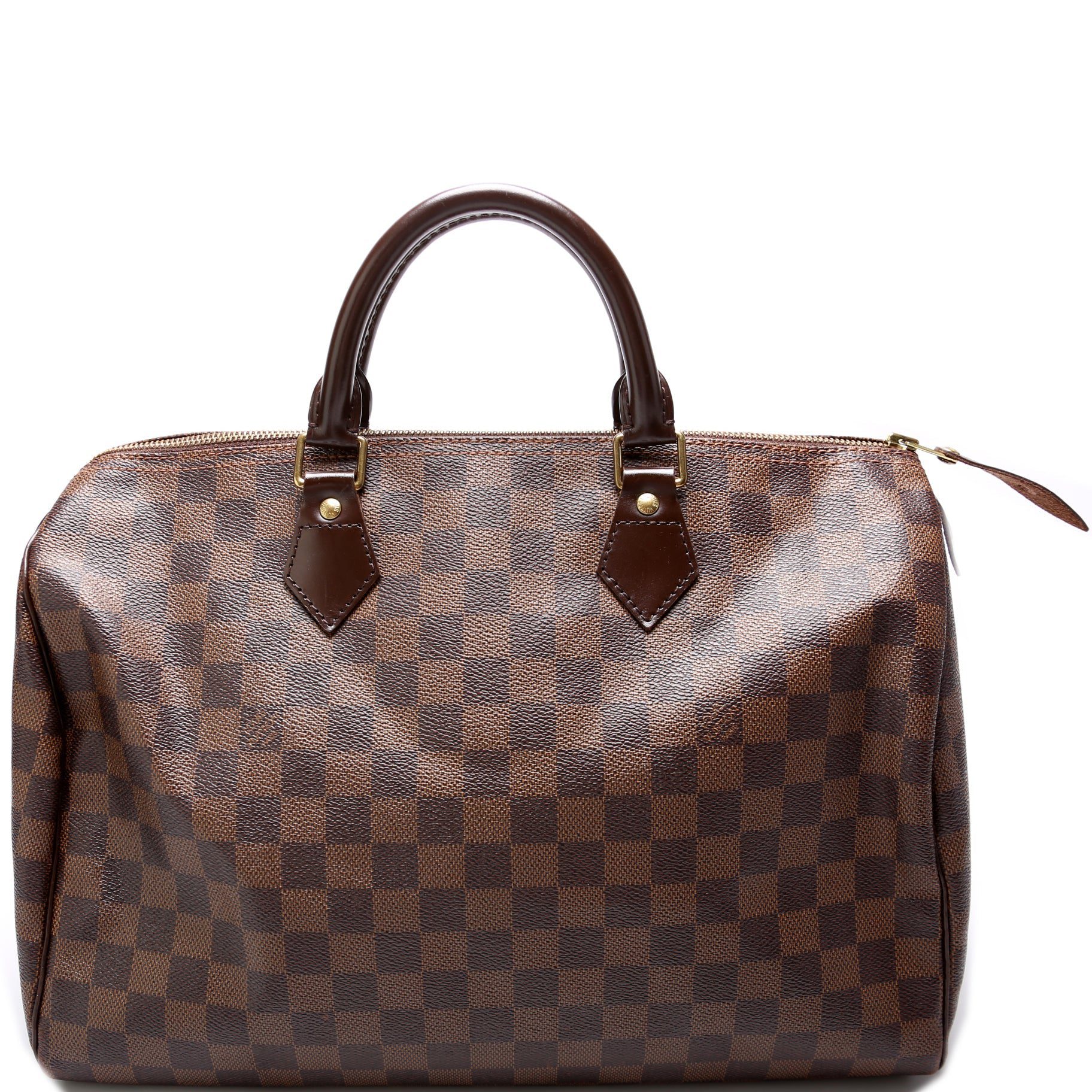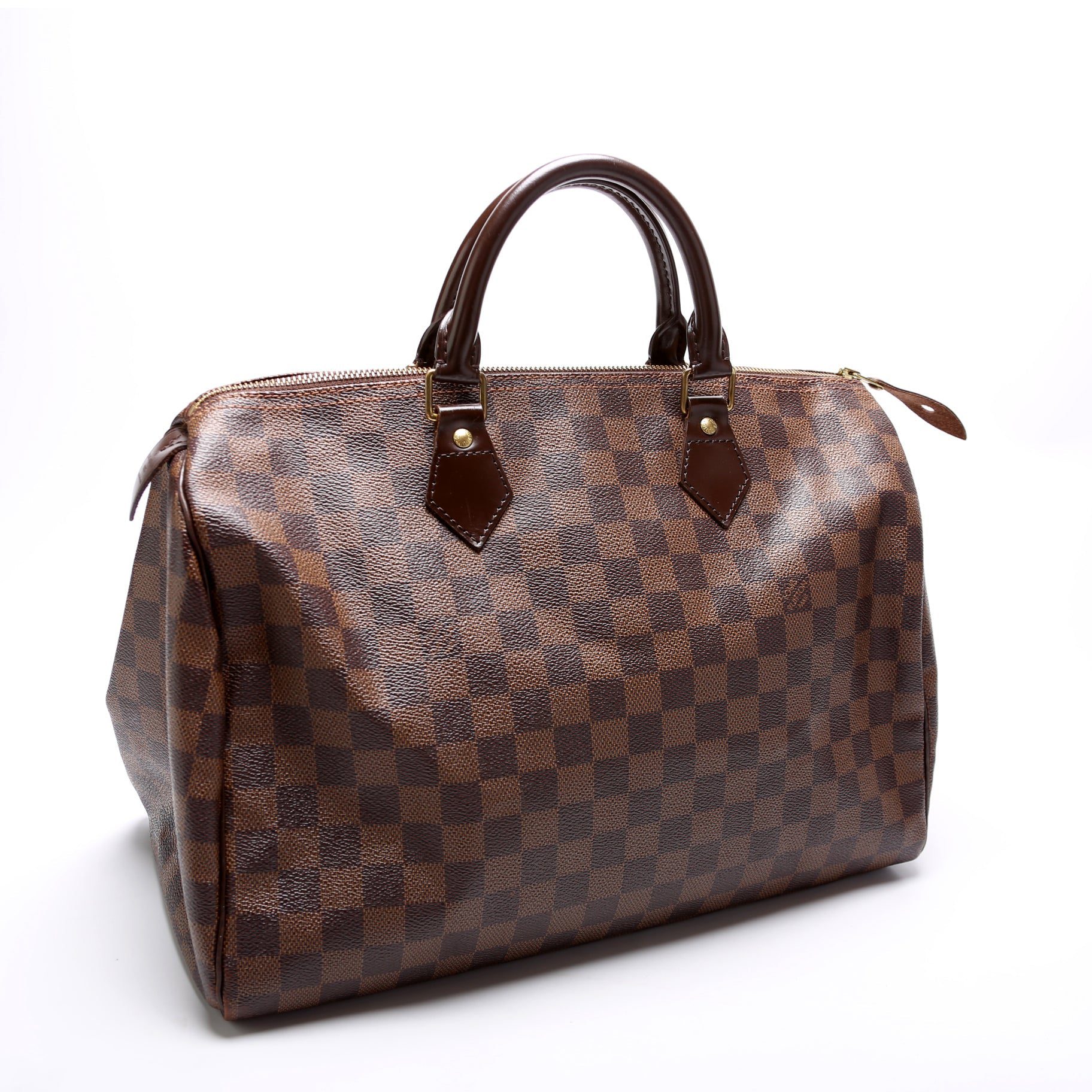Louis Vuitton Speedy 35. The exterior is in the classic Louis Vuitton Monogram coated canvas.Â