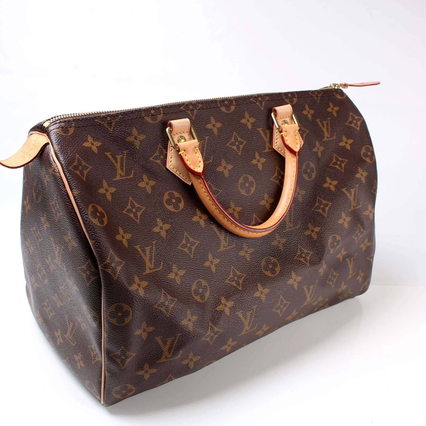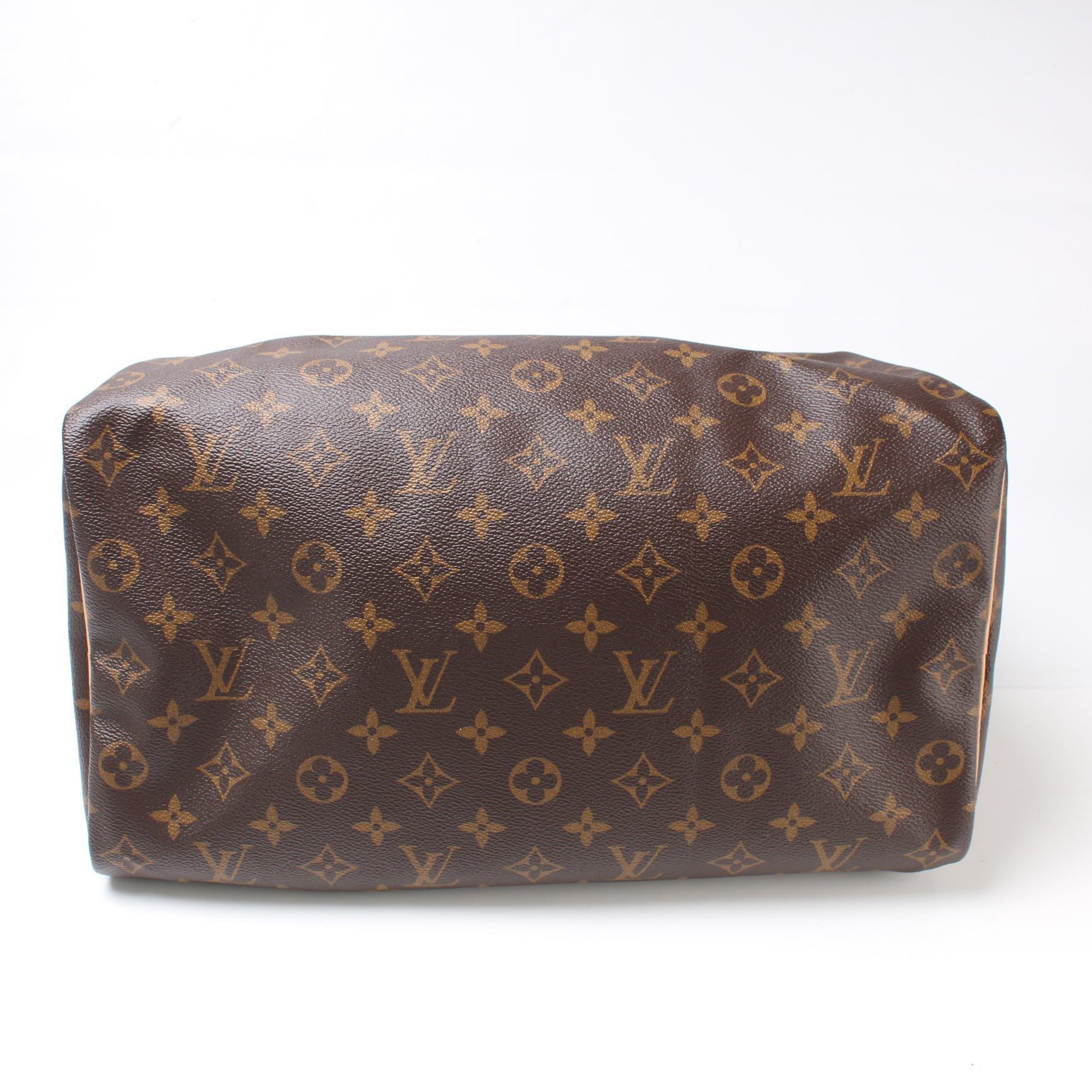 Louis Vuitton Speedy 35. The exterior is in the classic Louis Vuitton Monogram coated canvas.