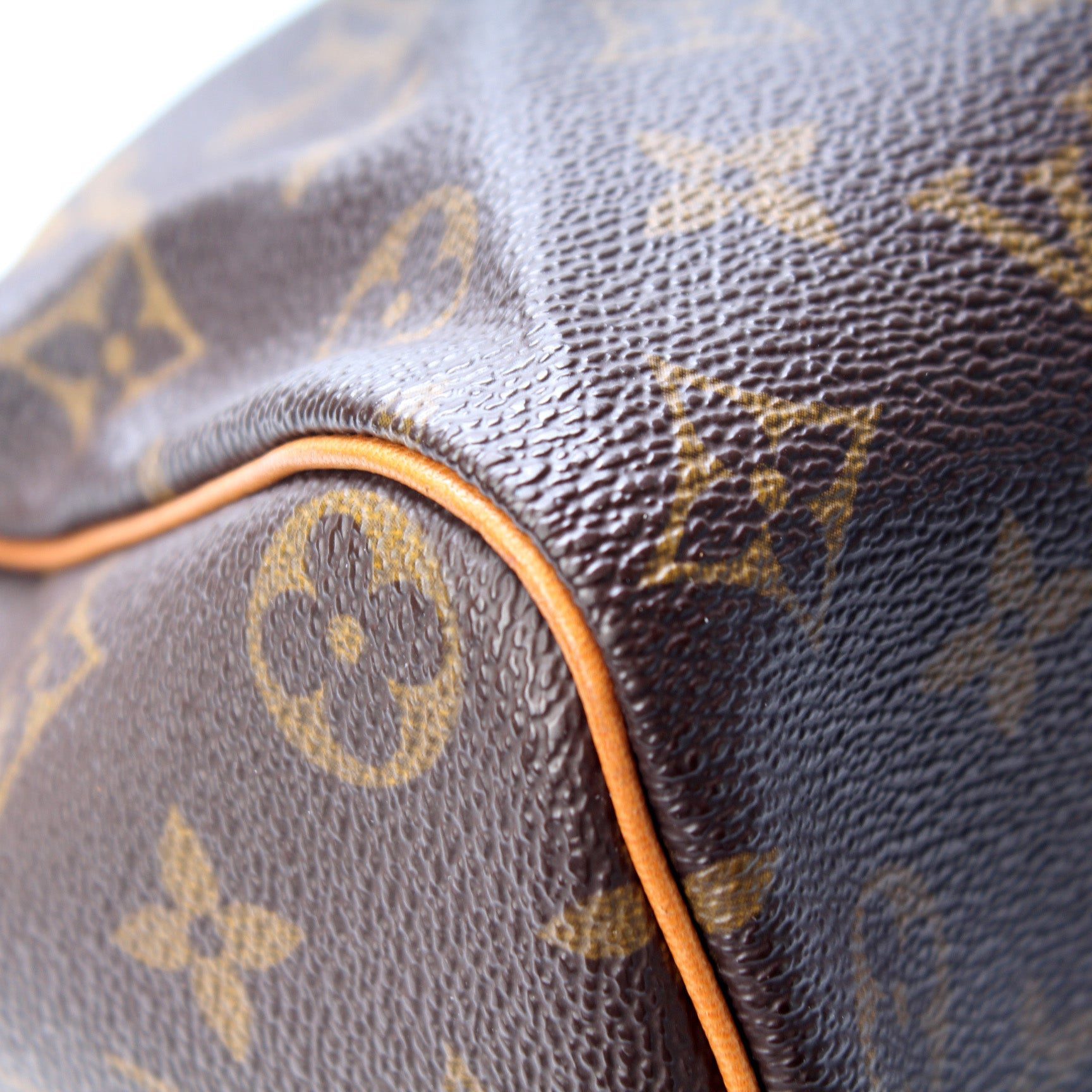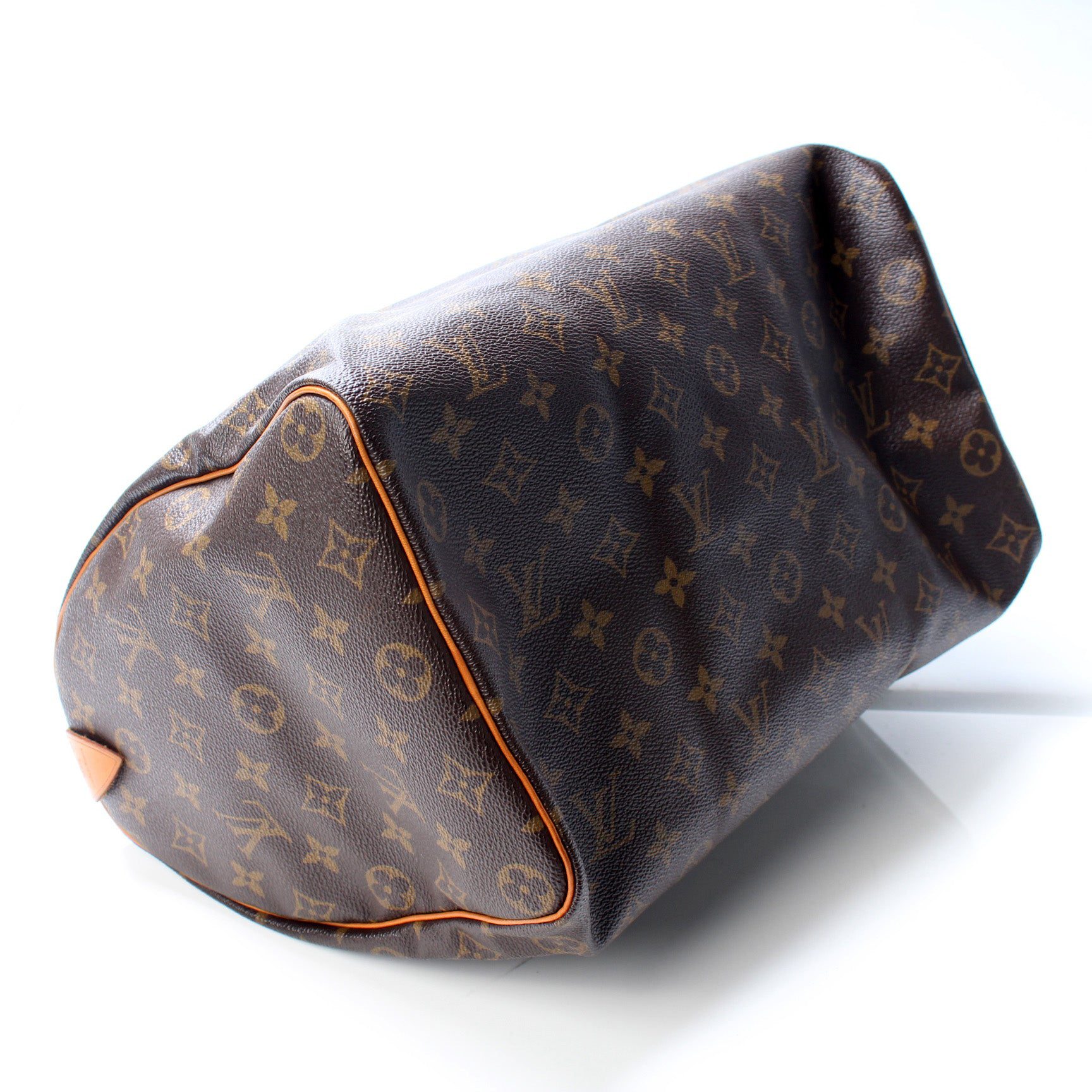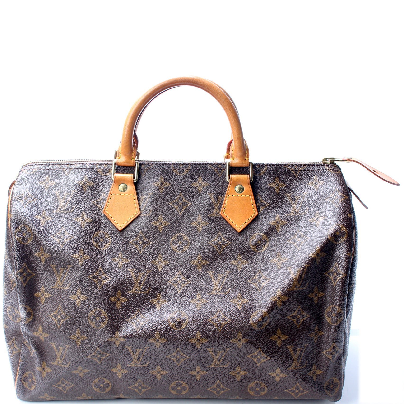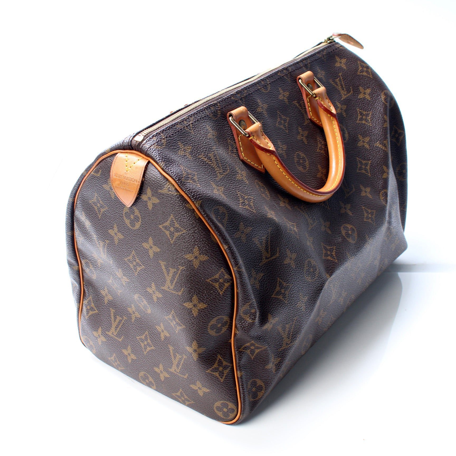 Louis Vuitton Speedy 35. The exterior is in the classic Louis Vuitton Monogram coated canvas.Â