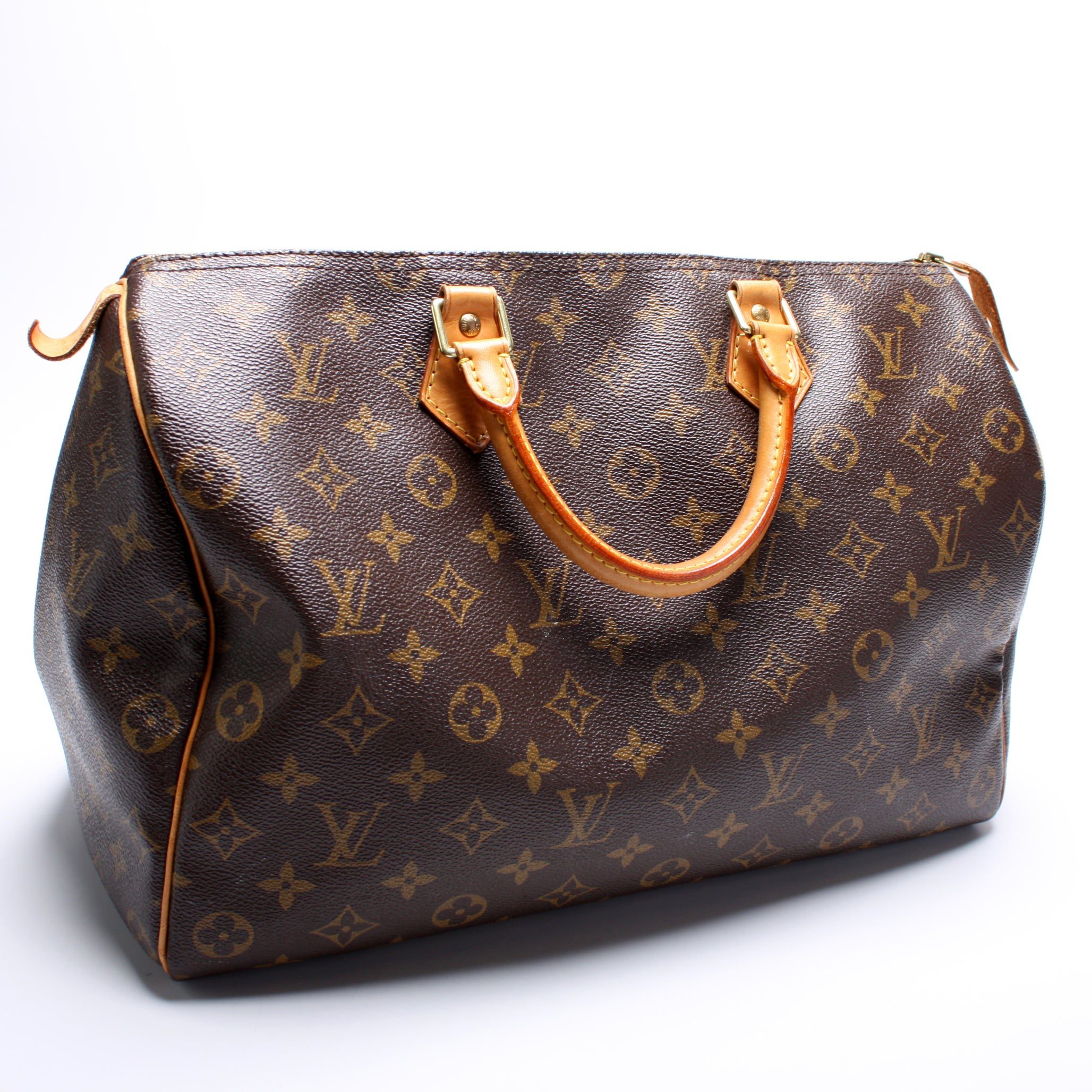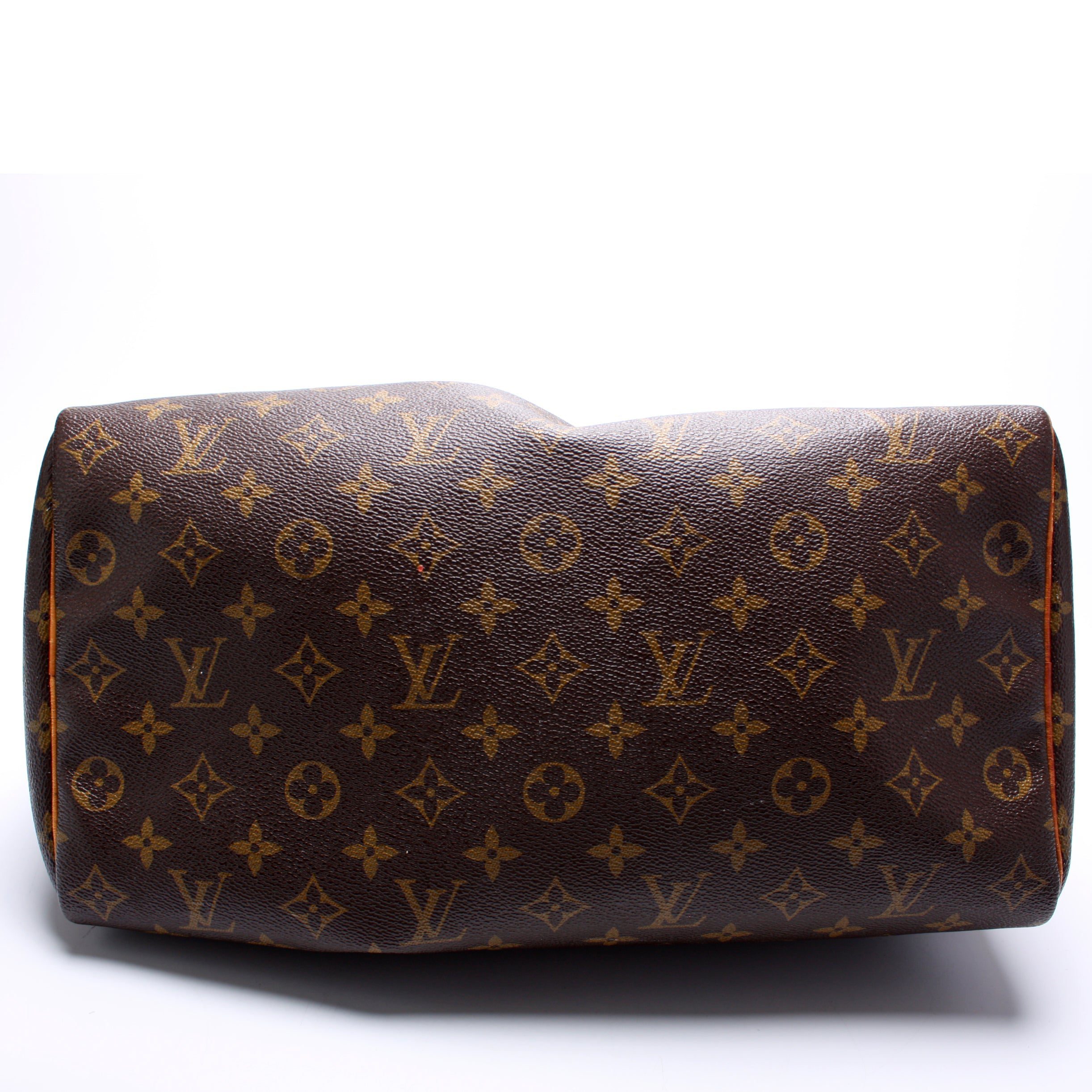 Louis Vuitton Speedy 35. The exterior is in the classic Louis Vuitton Monogram coated canvas.