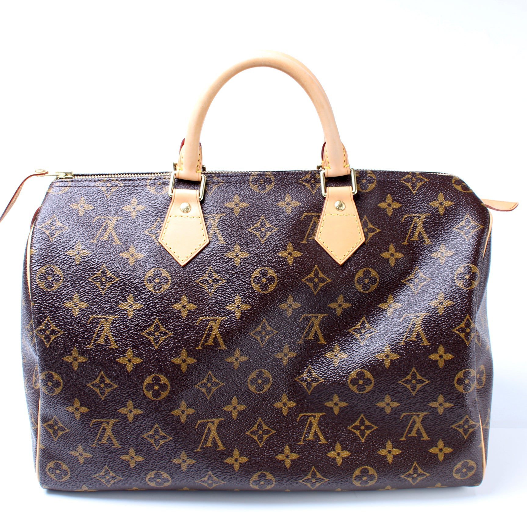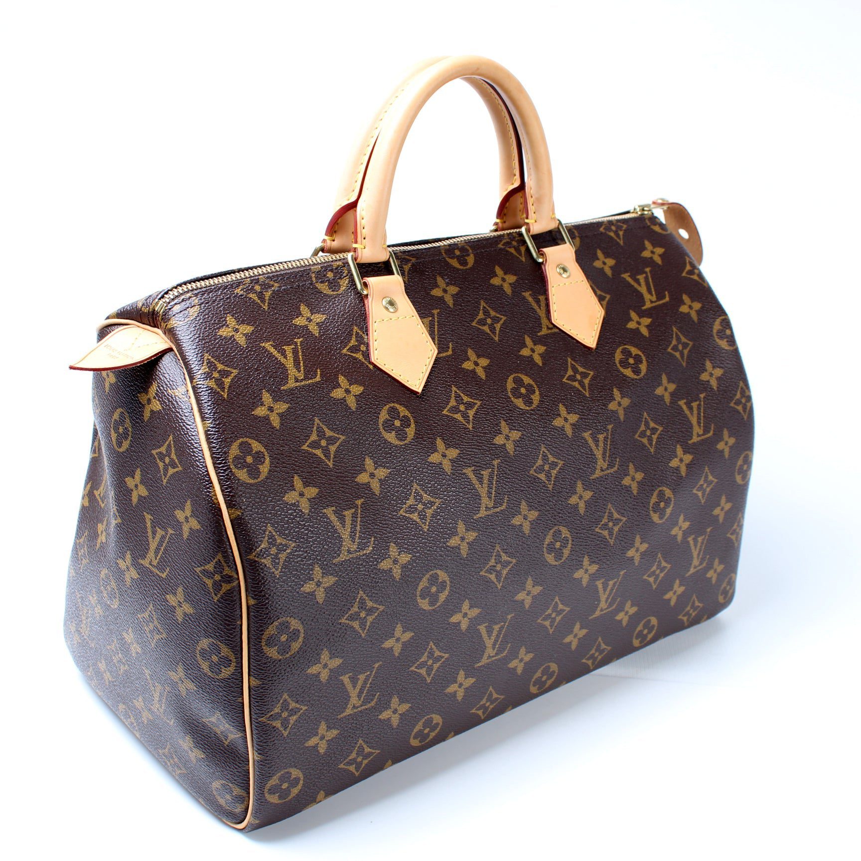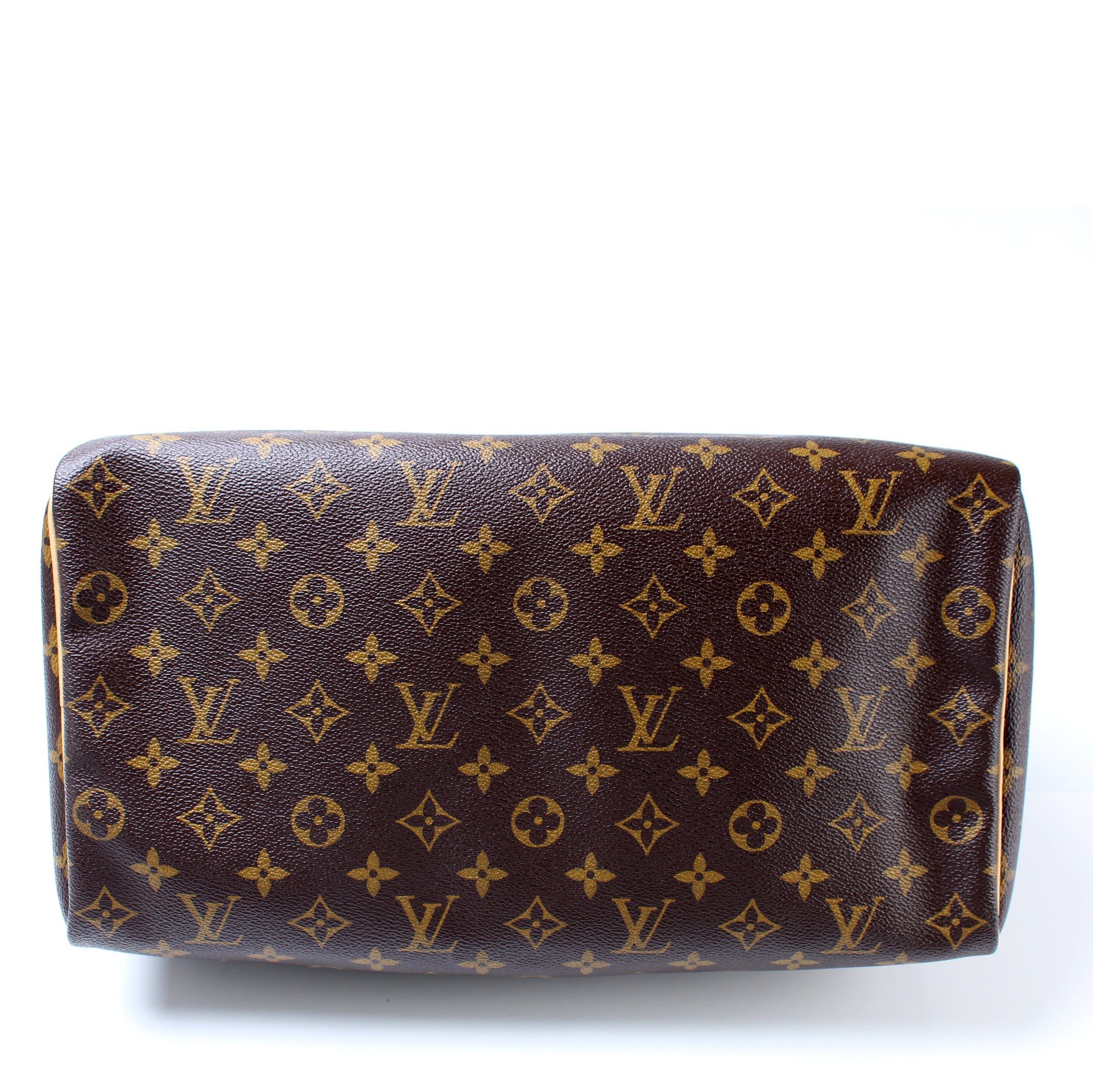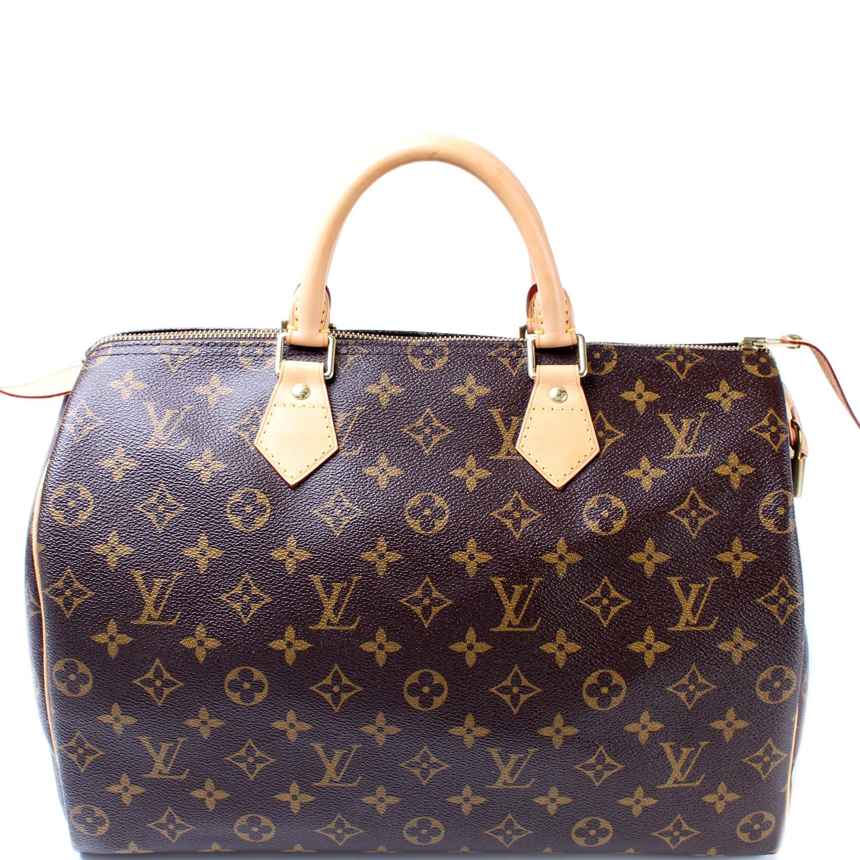 Louis Vuitton Speedy 35. The exterior is in the classic Louis Vuitton Monogram coated canvas.Â