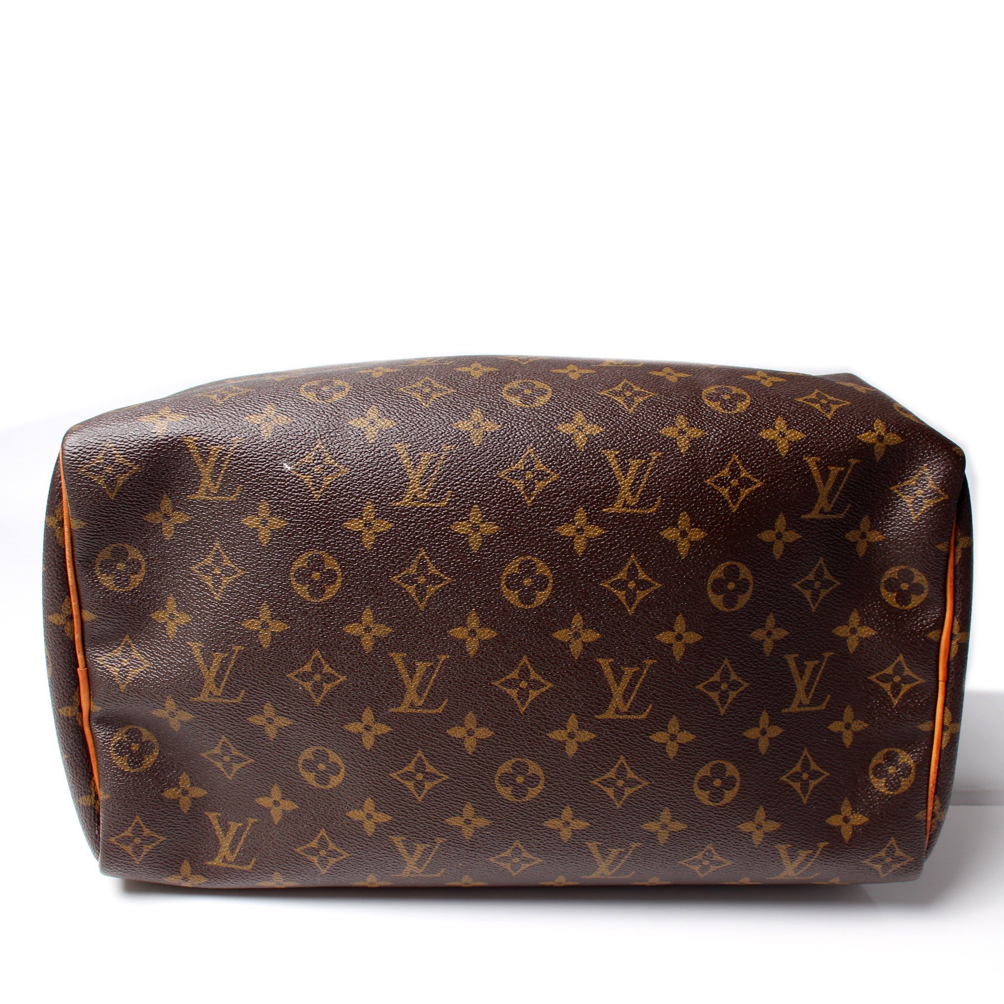 Louis Vuitton Speedy 35. The exterior is in the classic Louis Vuitton Monogram coated canvas.
