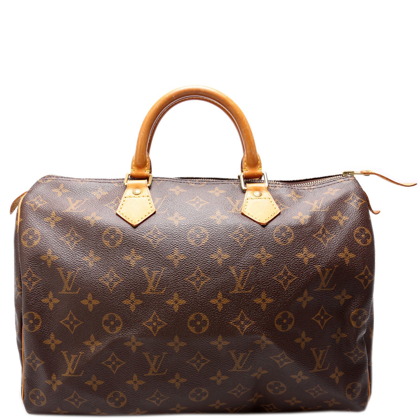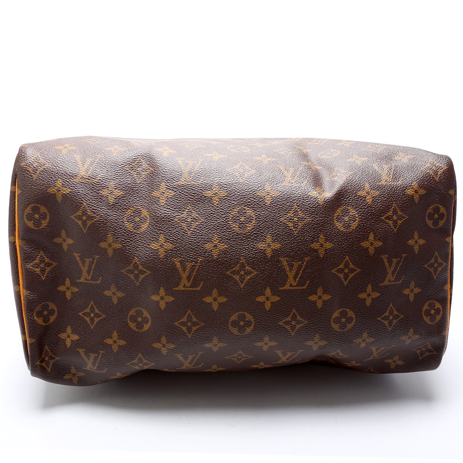 Louis Vuitton Speedy 35. The exterior is in the classic Louis Vuitton Monogram coated canvas.