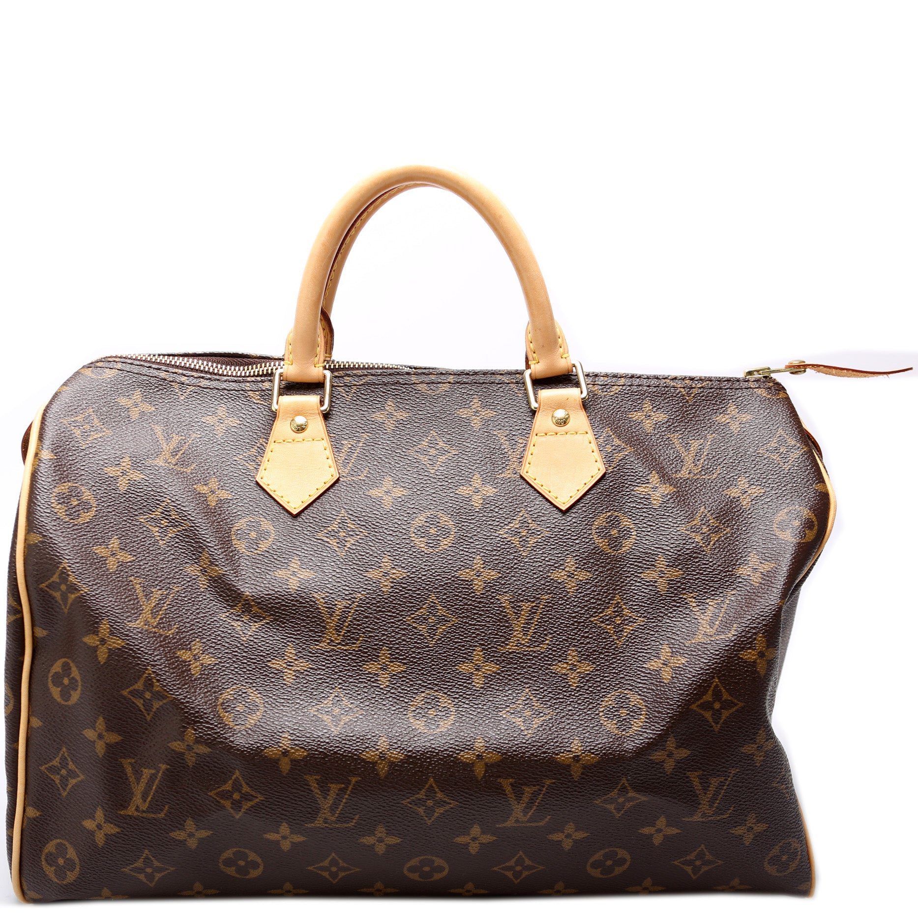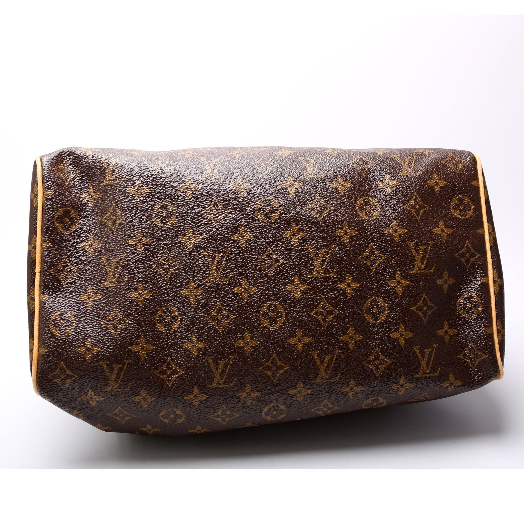 Louis Vuitton Speedy 35. The exterior is in the classic Louis Vuitton Monogram coated canvas.