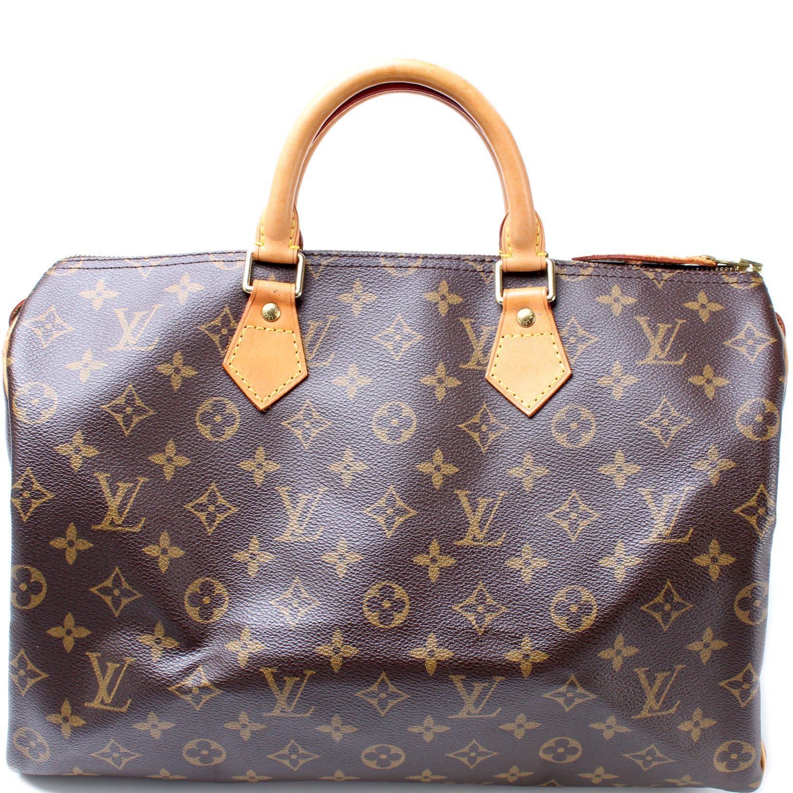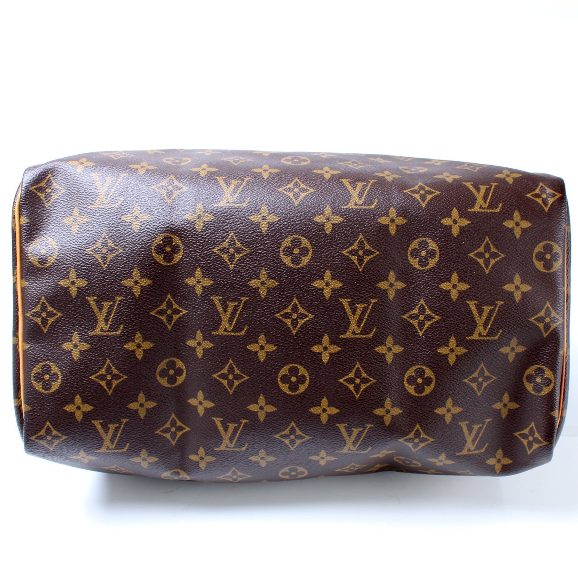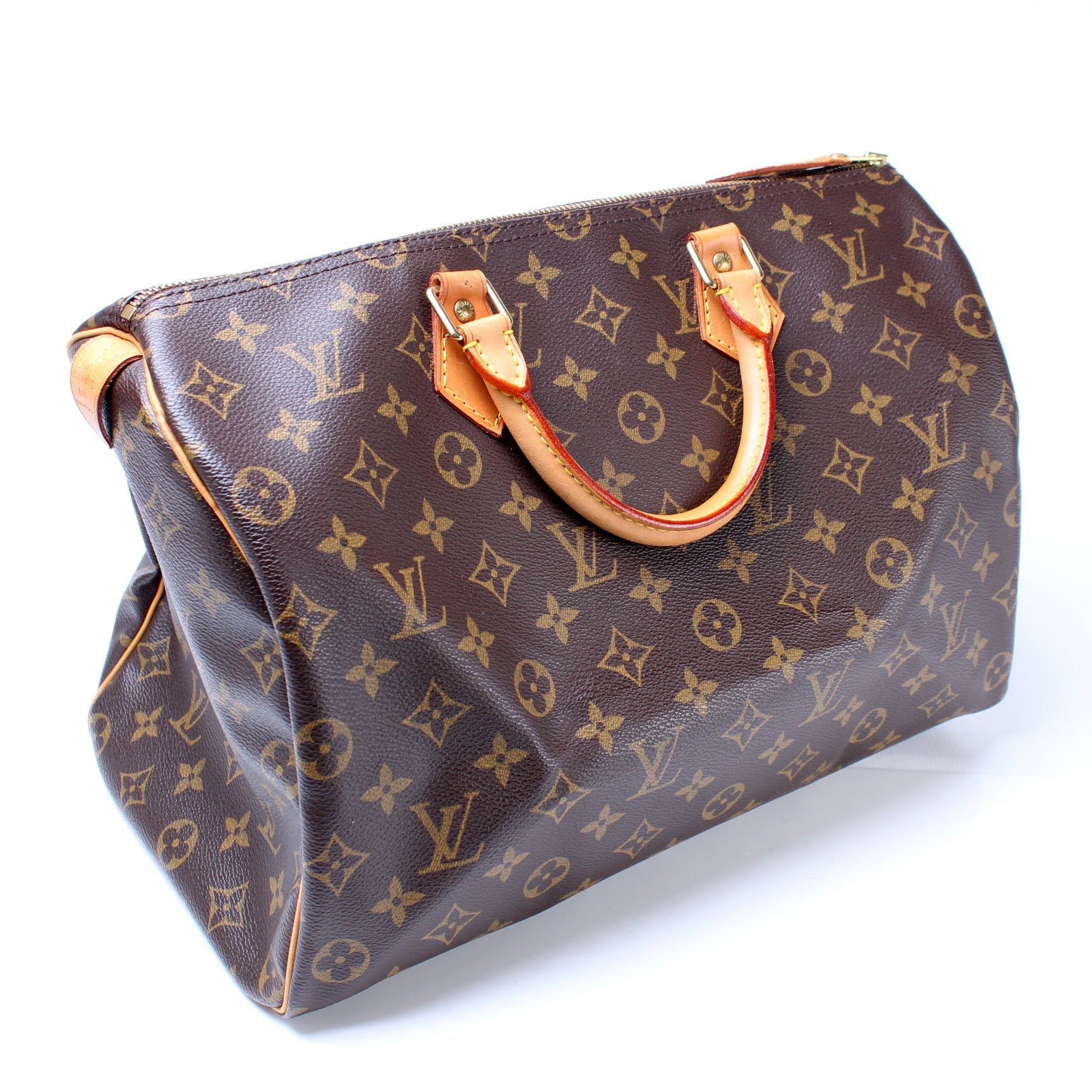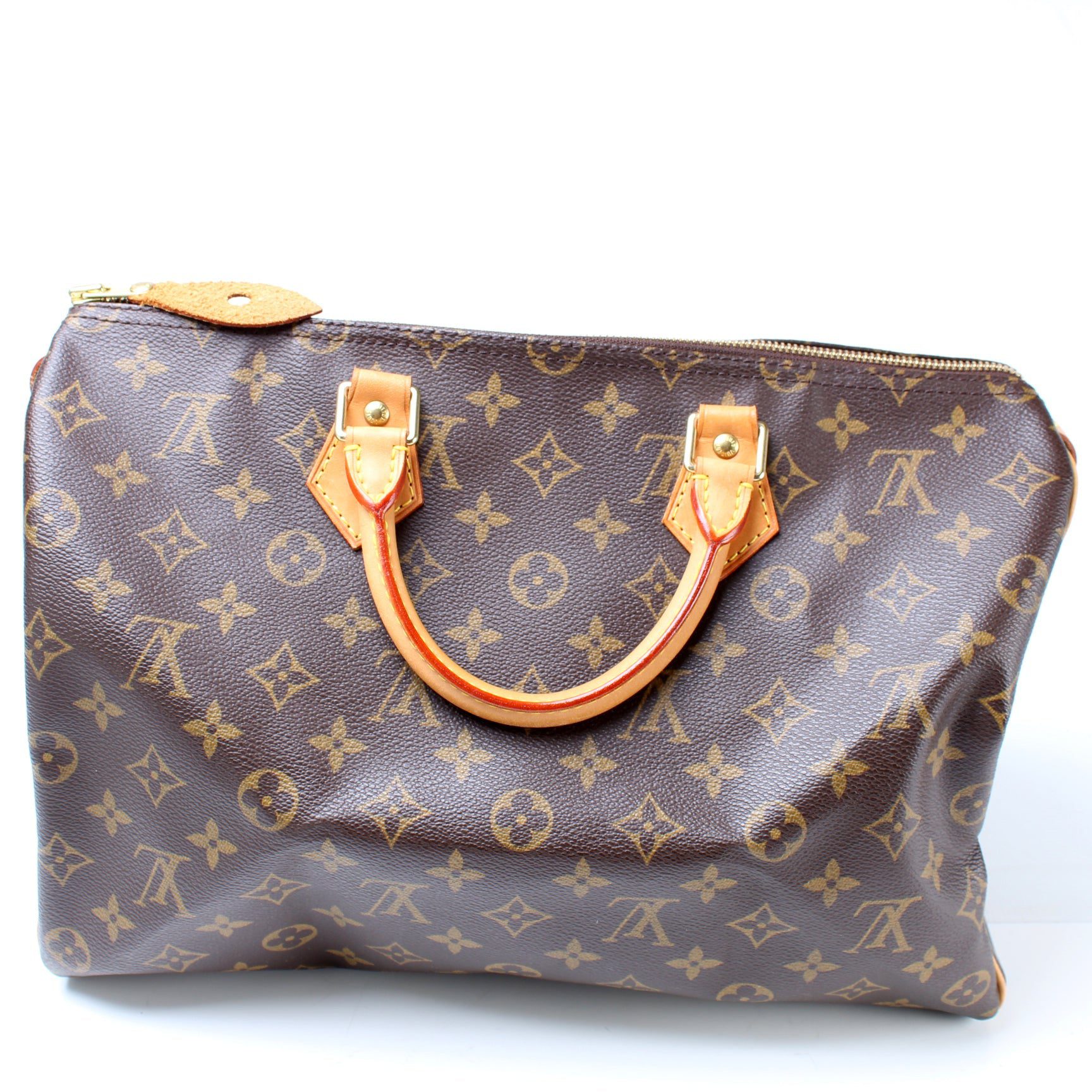 Louis Vuitton Speedy 35. The exterior is in the classic Louis Vuitton Monogram coated canvas.Â