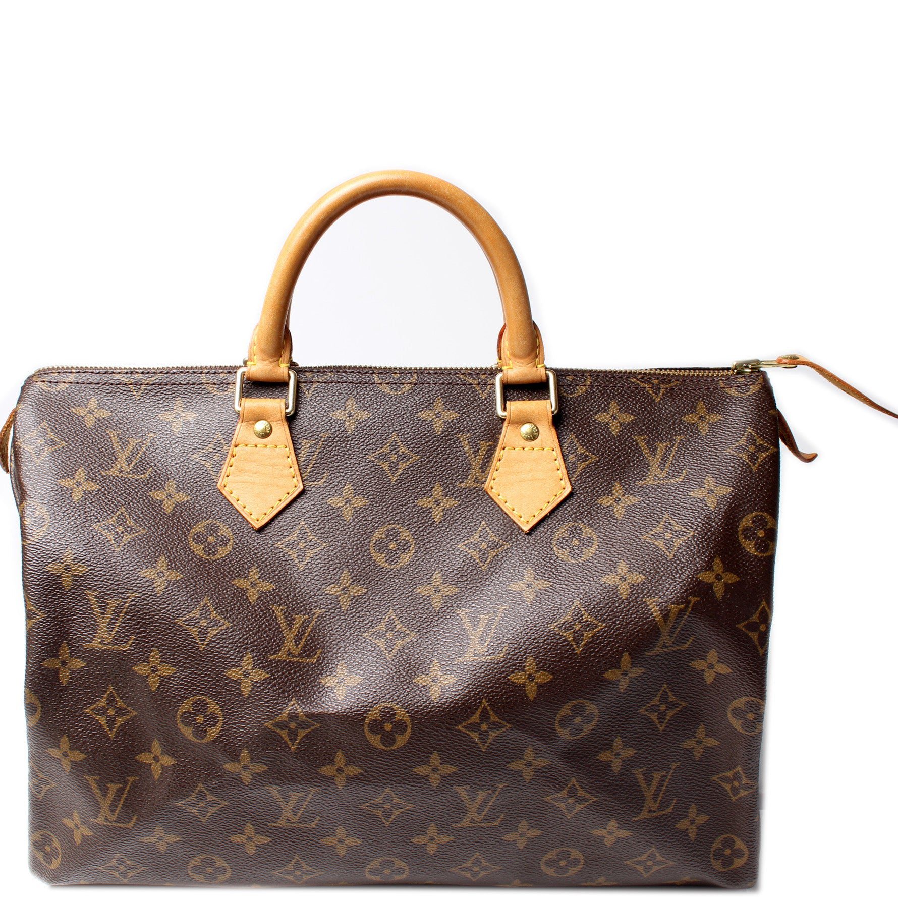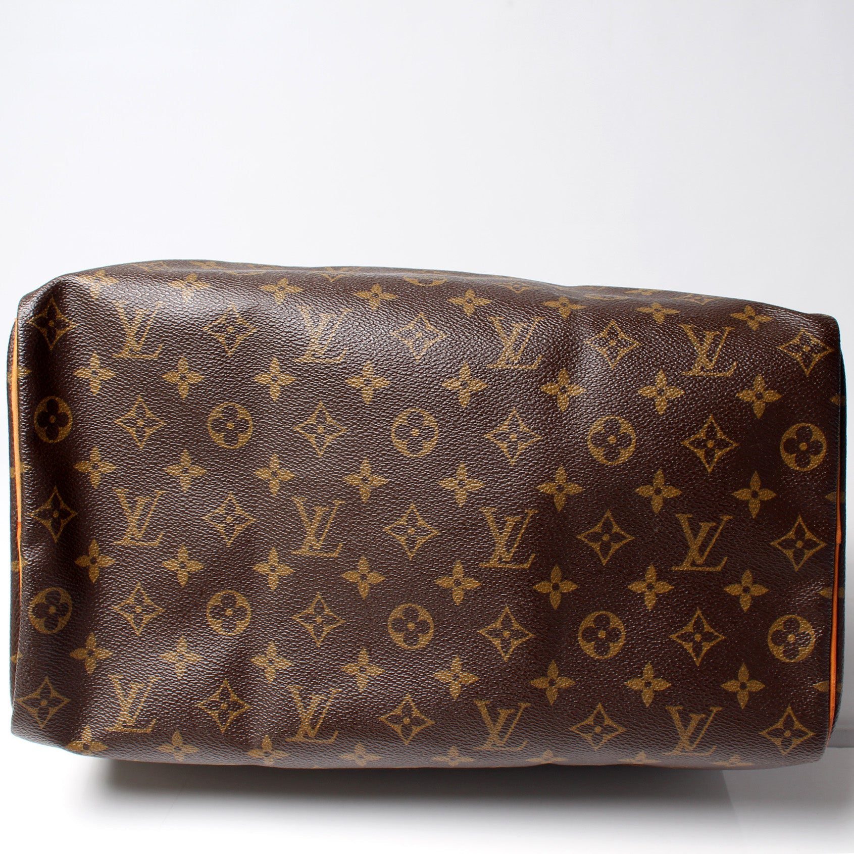 Louis Vuitton Speedy 35. The exterior is in the classic Louis Vuitton Monogram coated canvas.