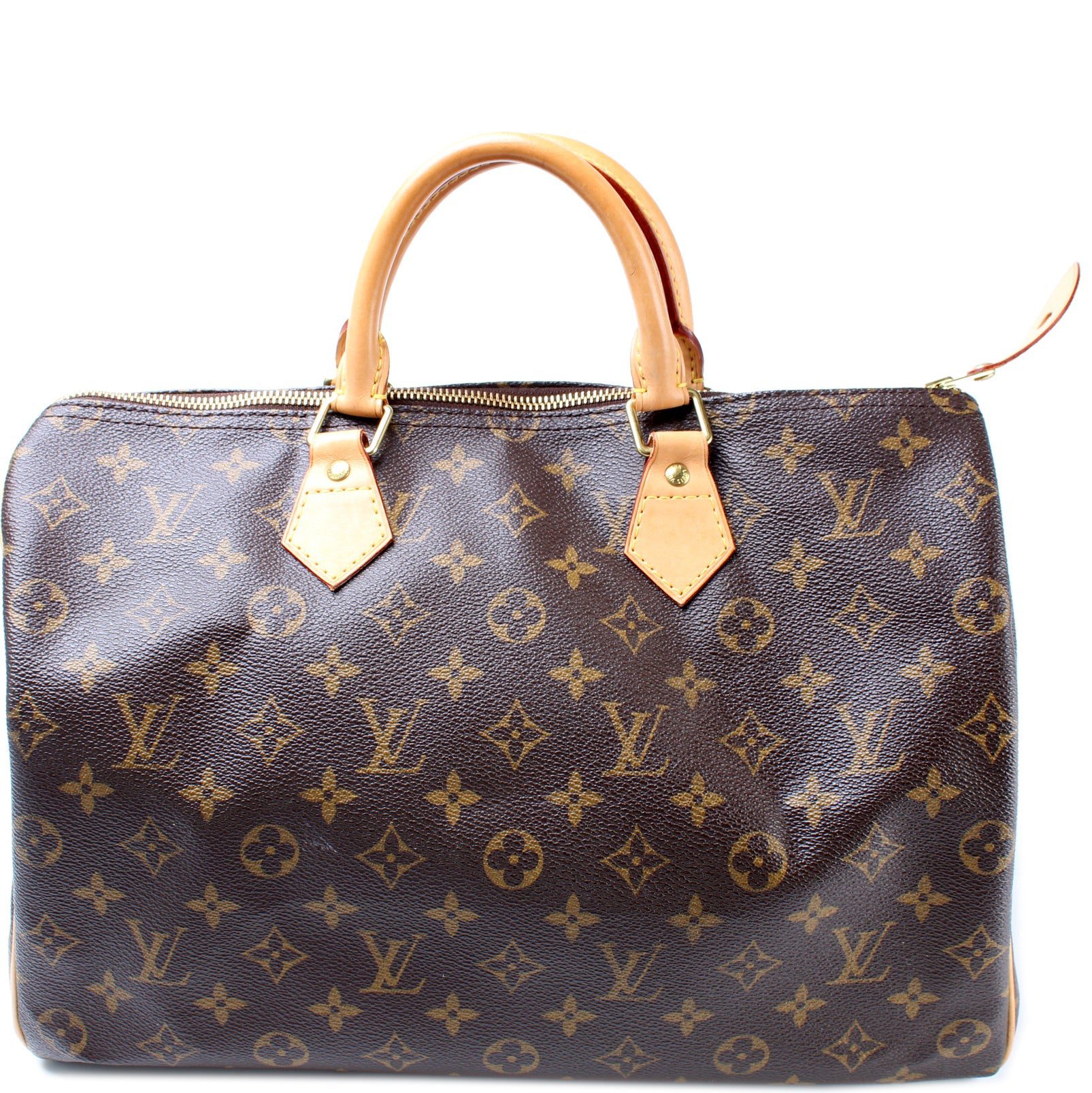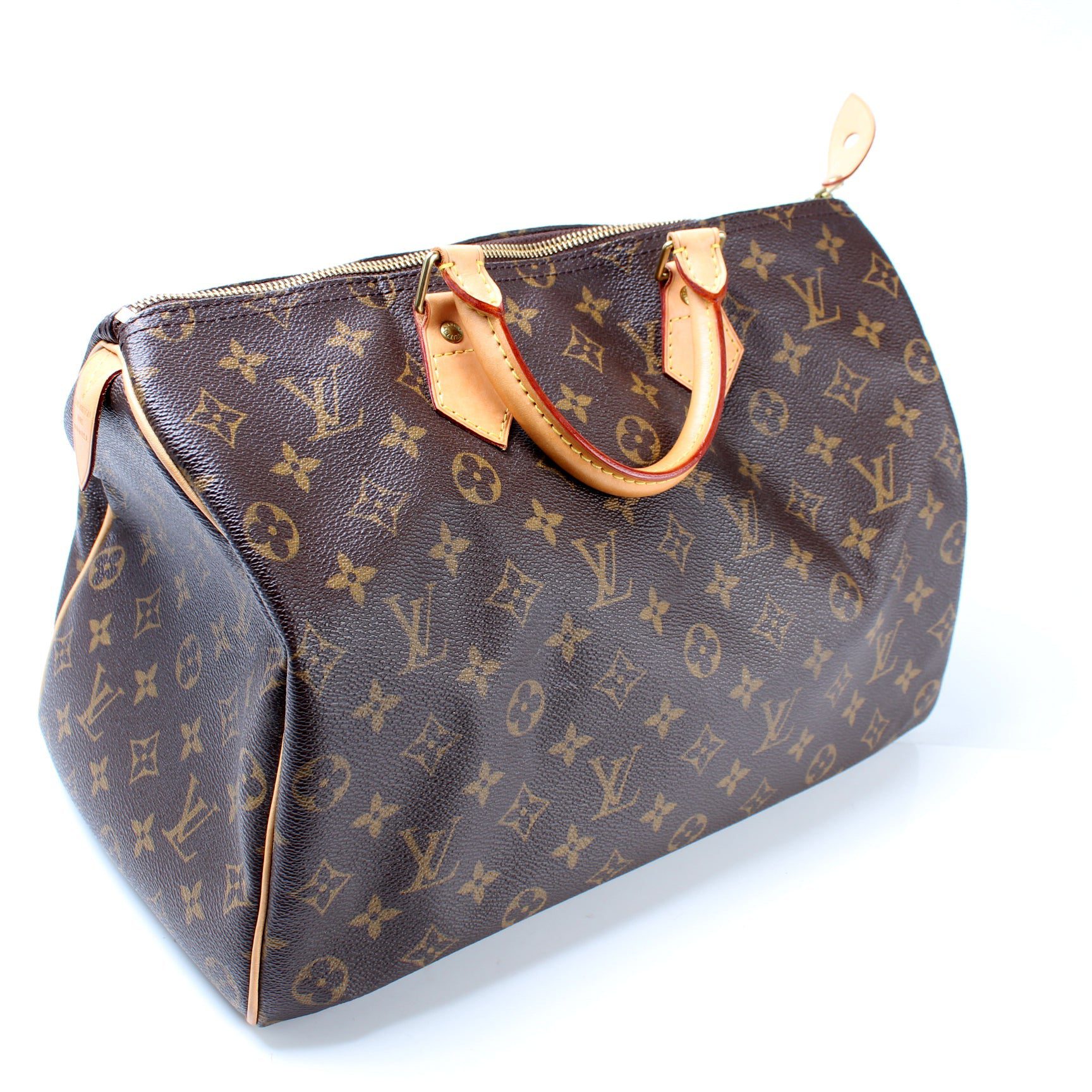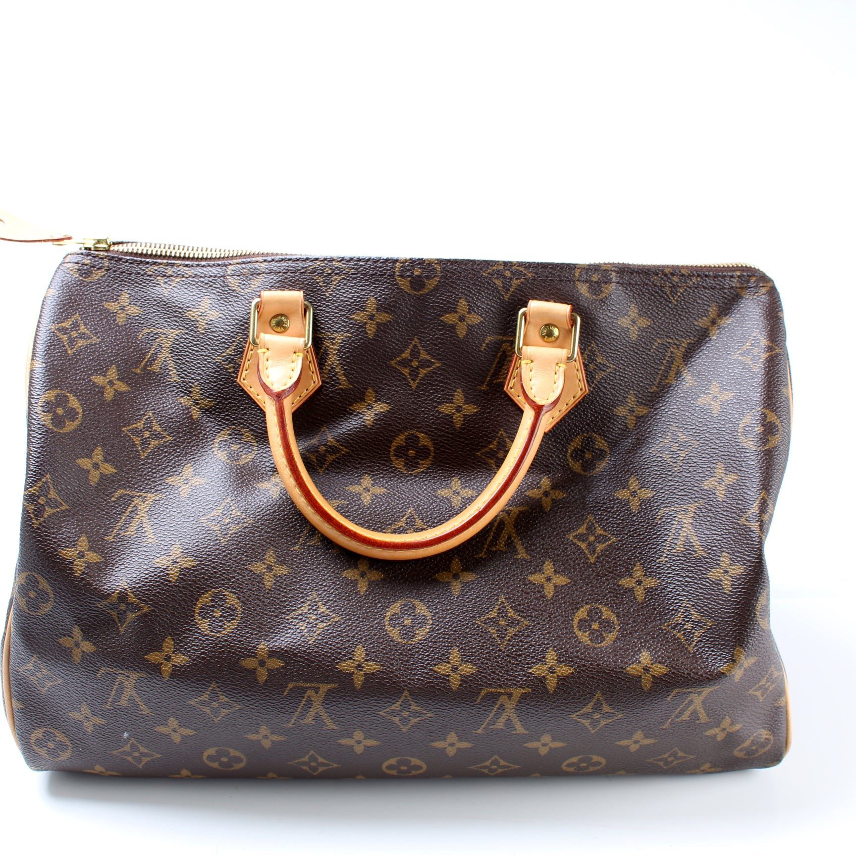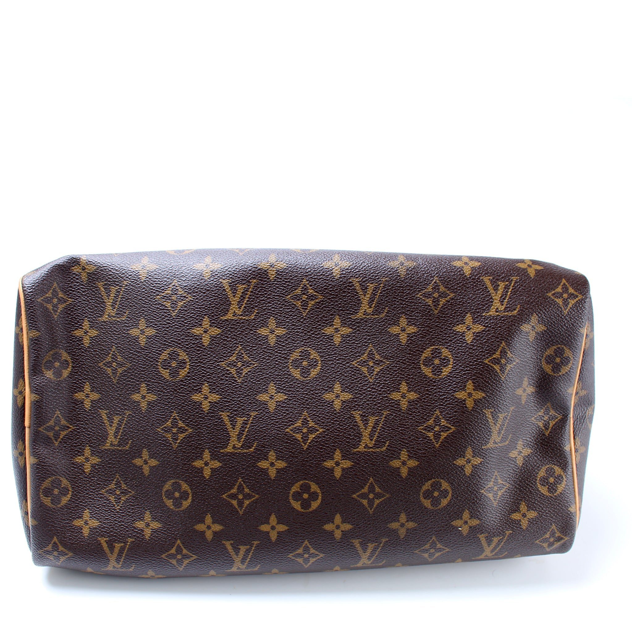 Louis Vuitton Speedy 35. The exterior is in the classic Louis Vuitton Monogram coated canvas.Â