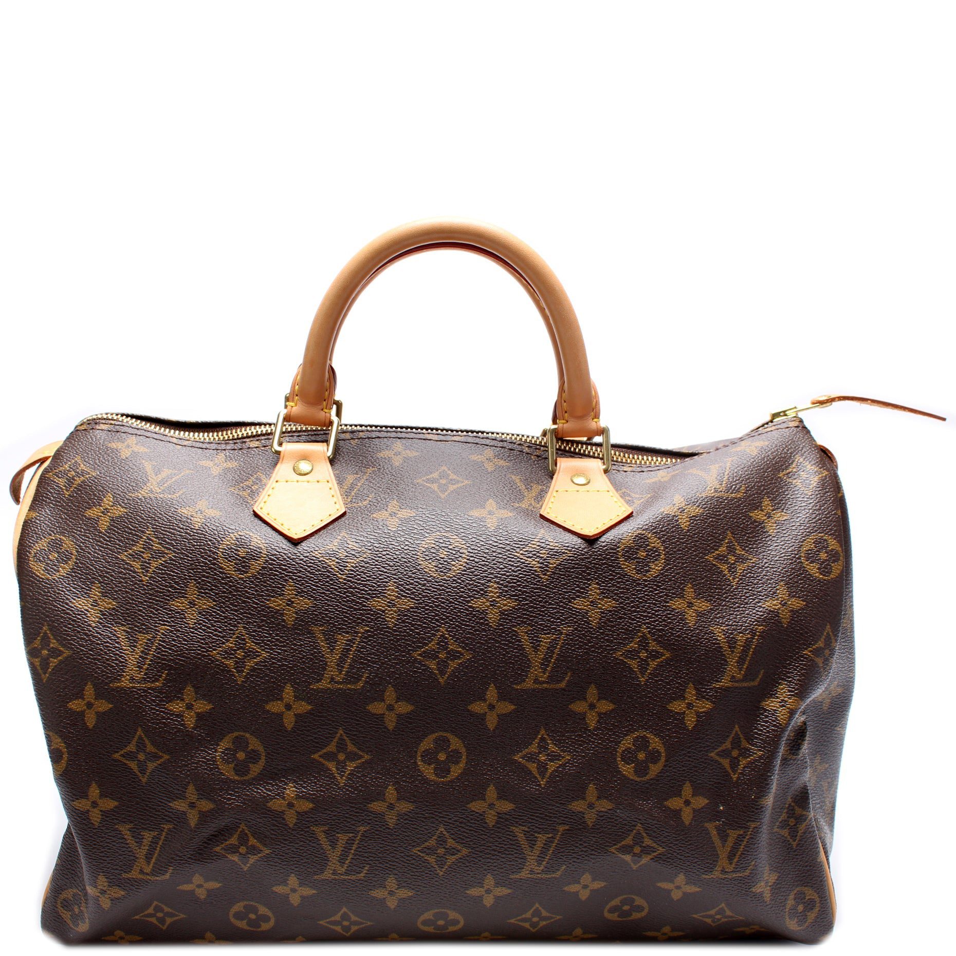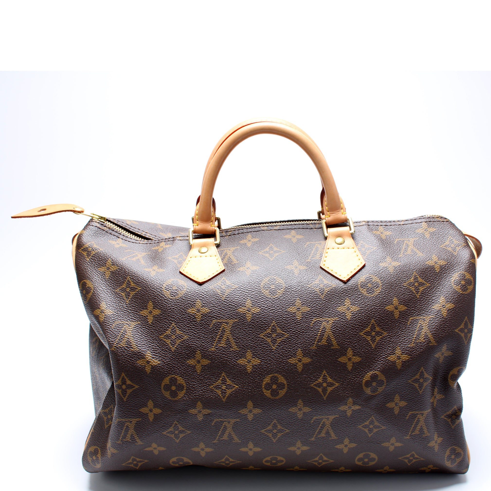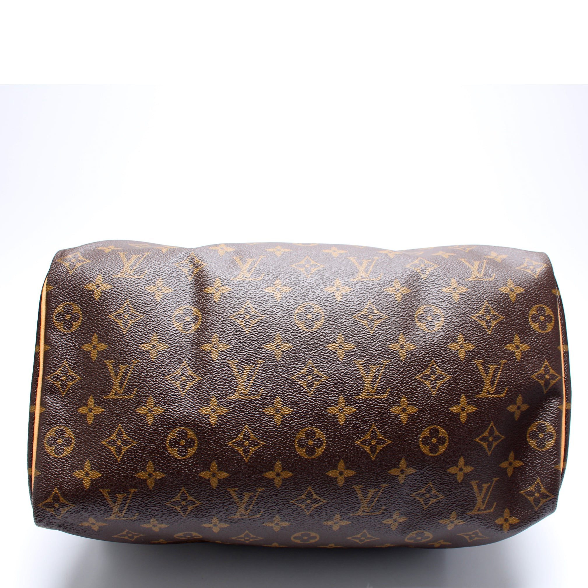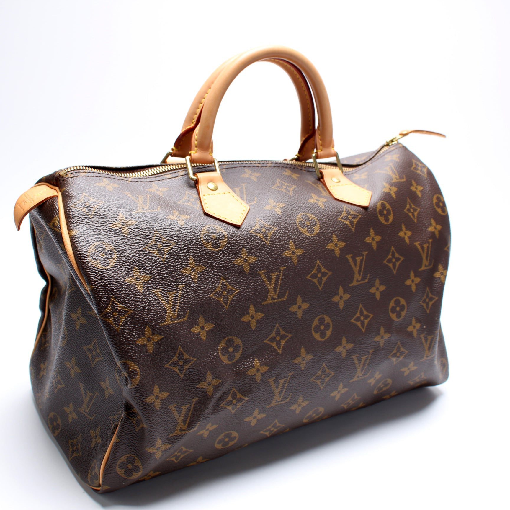 Louis Vuitton Speedy 35. The exterior is in the classic Louis Vuitton Monogram coated canvas.Â