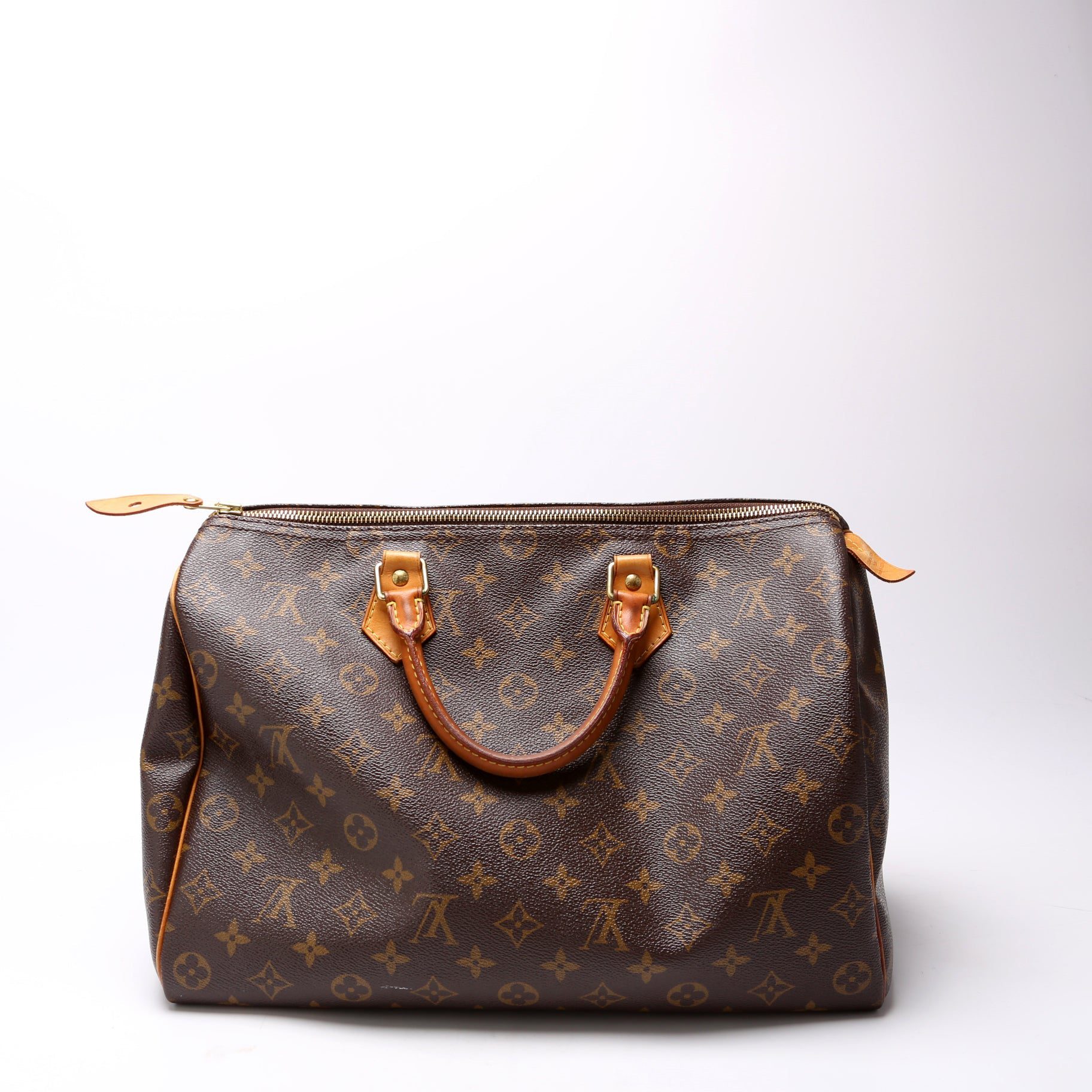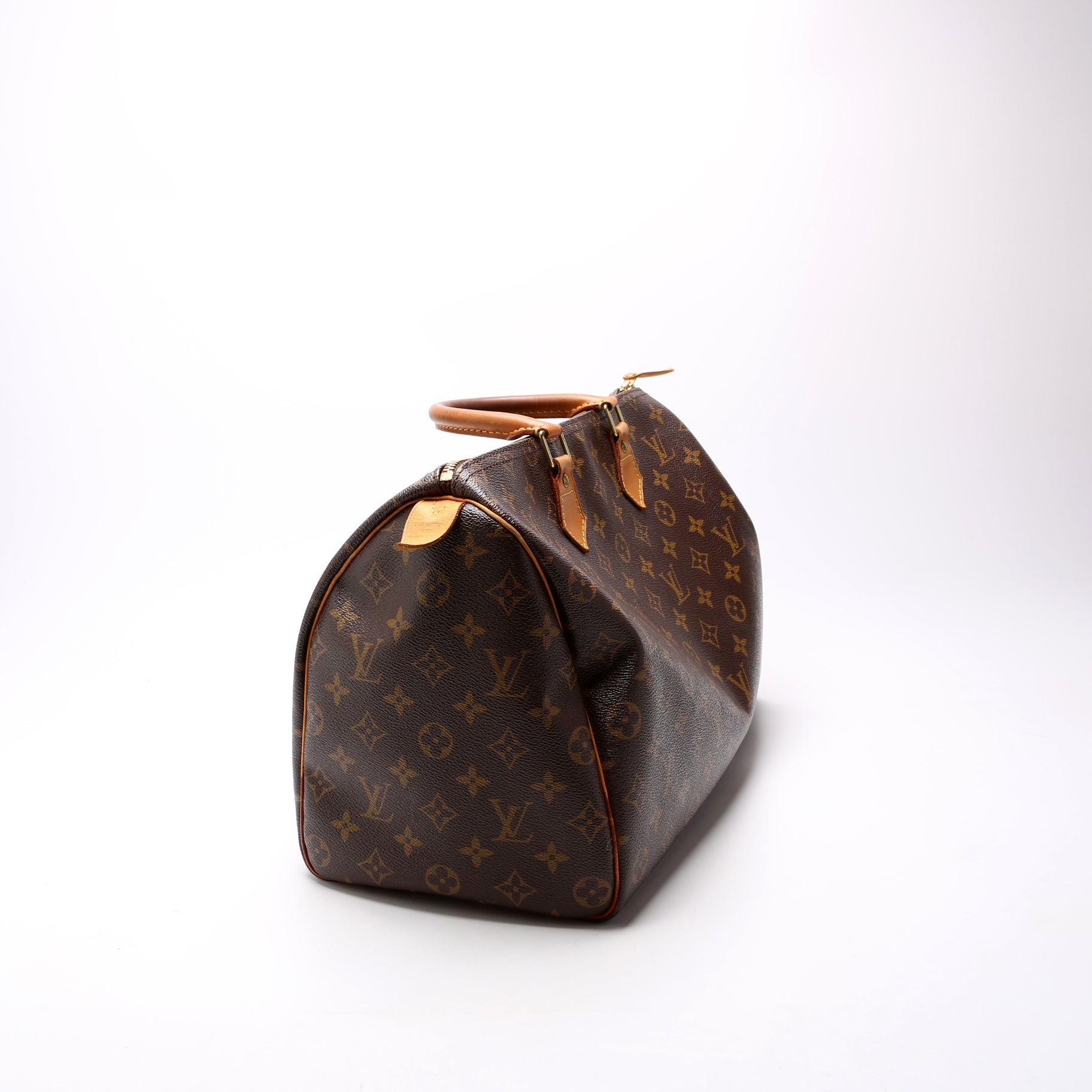 Louis Vuitton Speedy 35. The exterior is in the classic Louis Vuitton Monogram coated canvas.