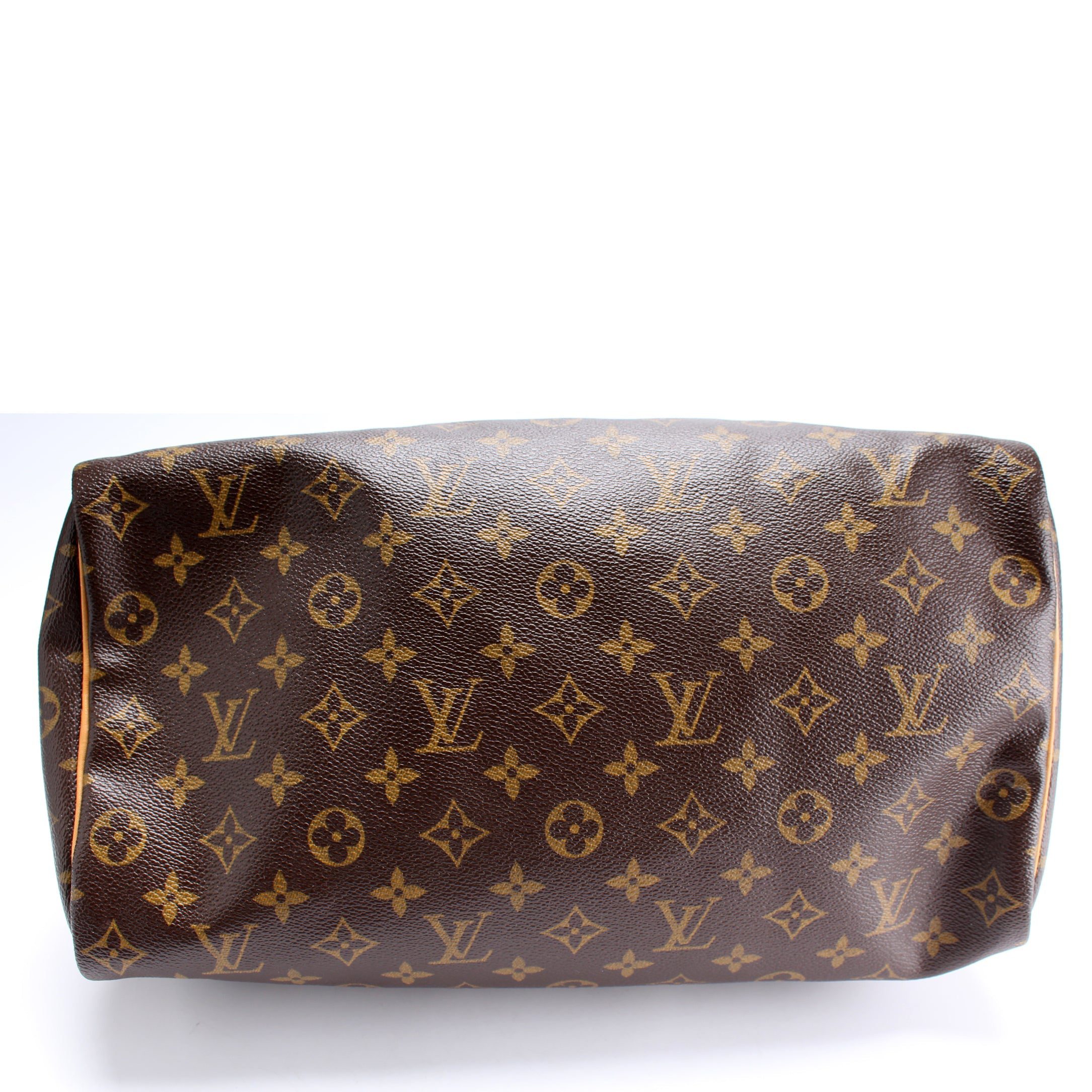 Louis Vuitton Speedy 35. The exterior is in the classic Louis Vuitton Monogram coated canvas.