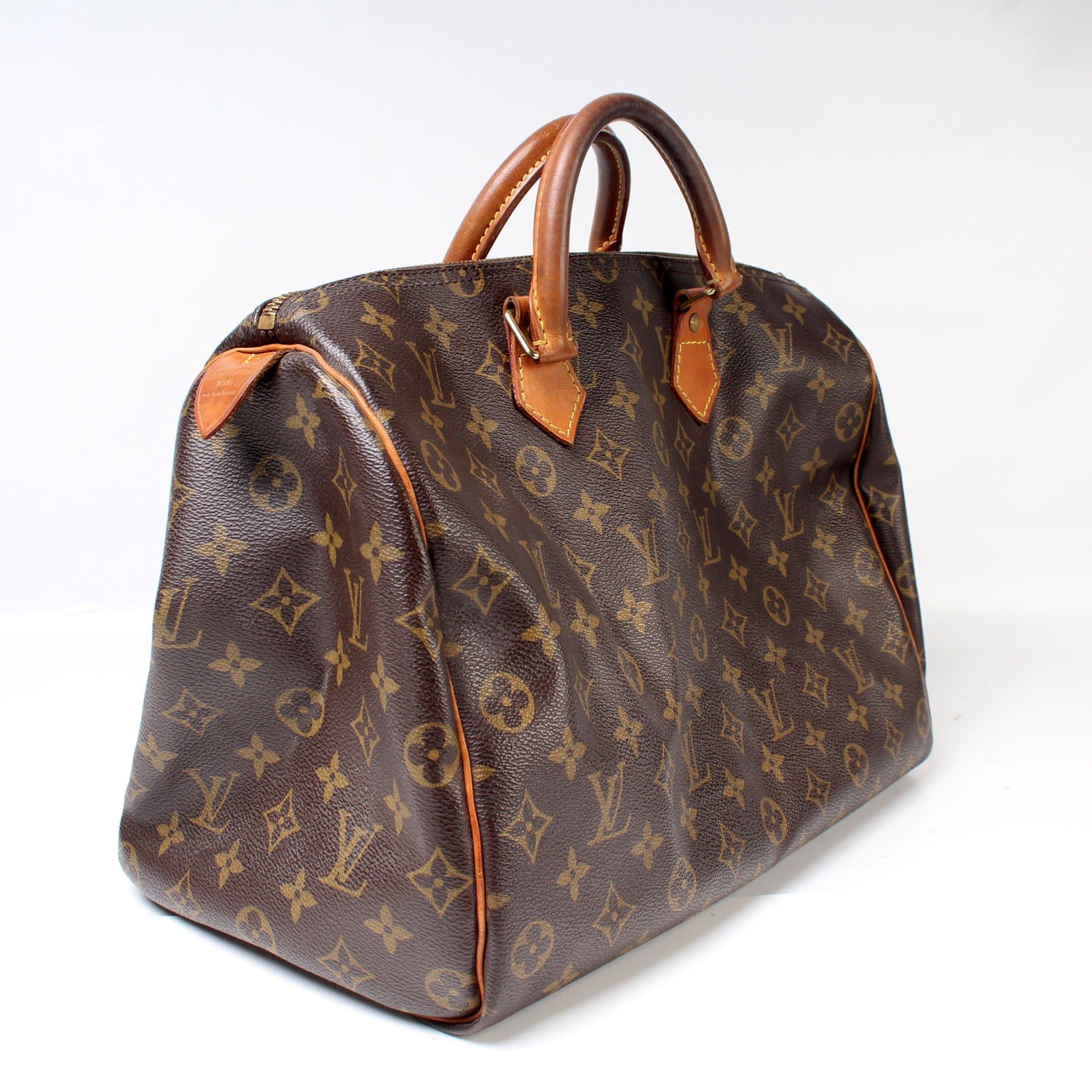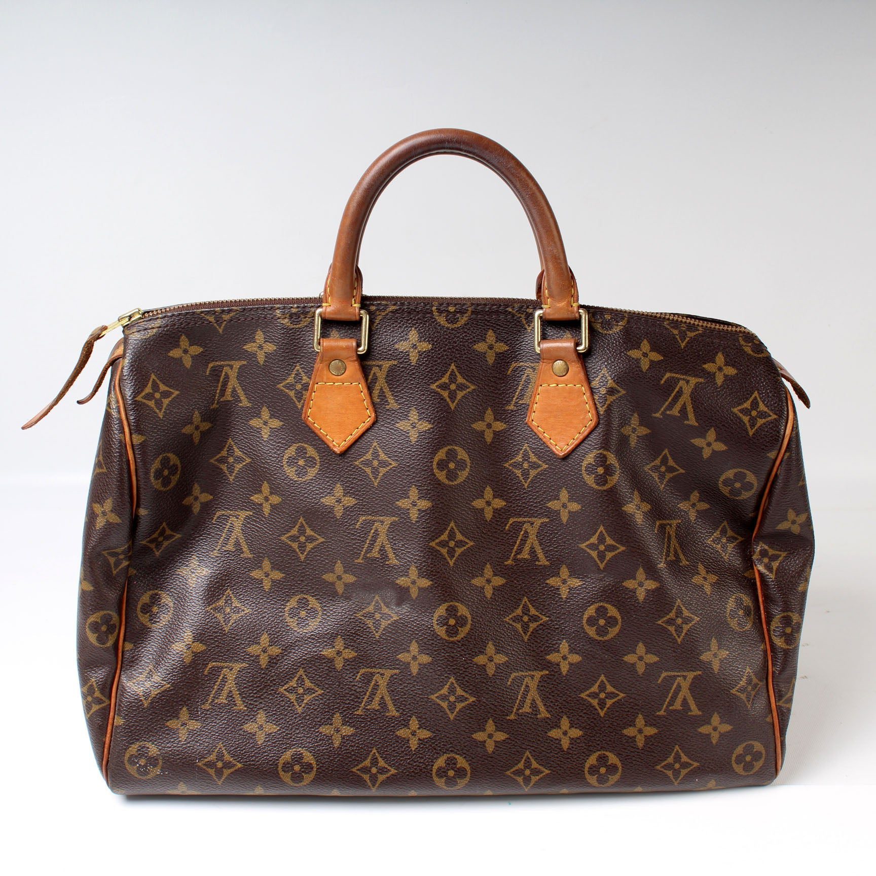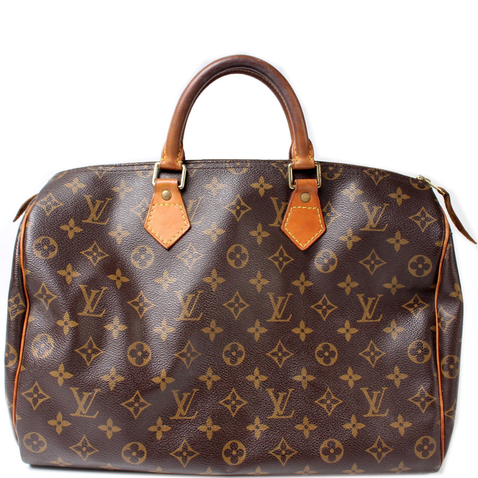 Louis Vuitton Speedy 35. The exterior is in the classic Louis Vuitton Monogram coated canvas.Â