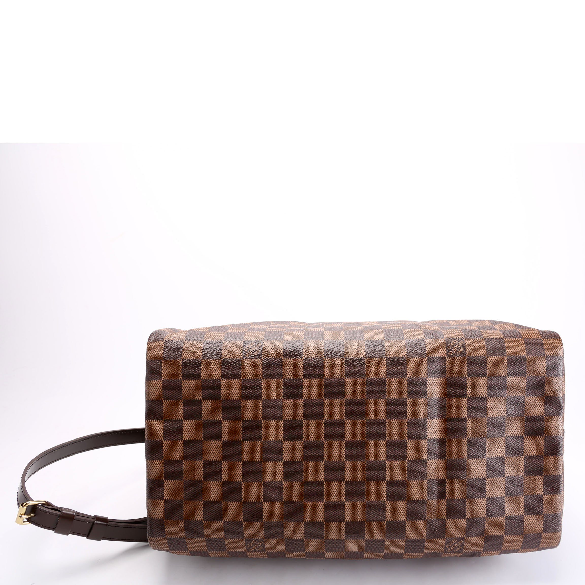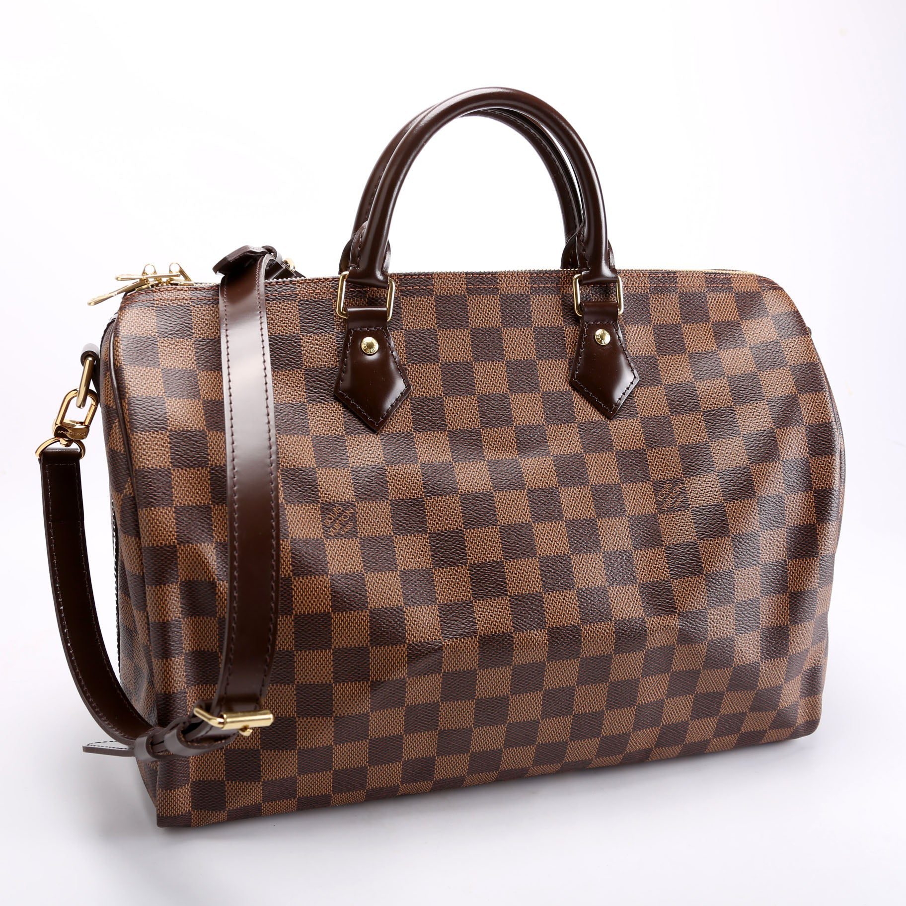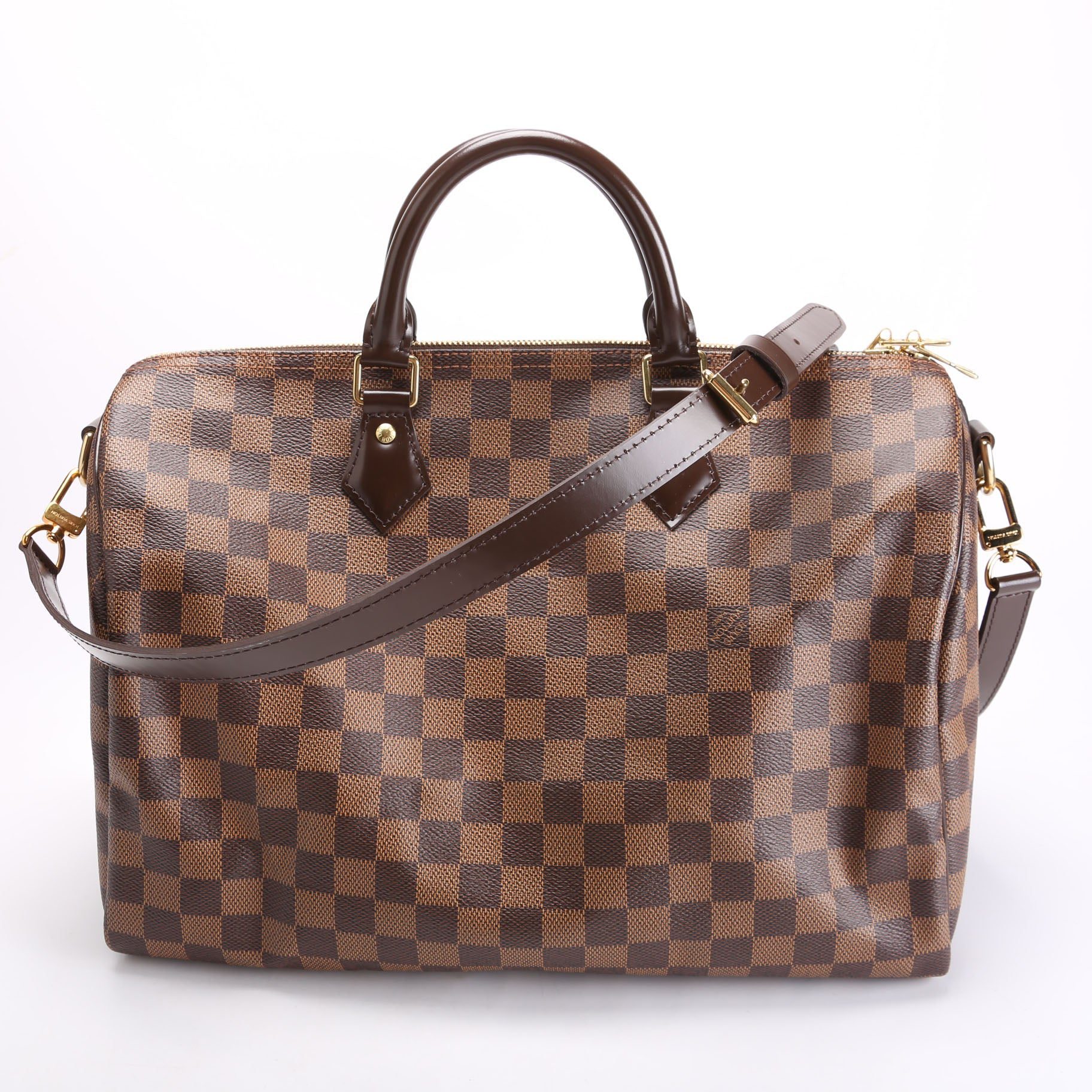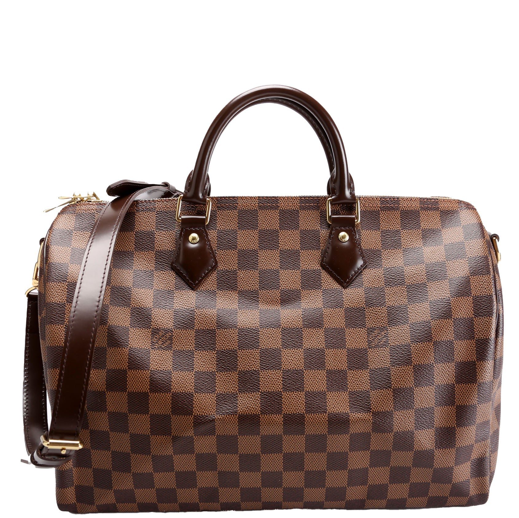 Louis Vuitton Speedy 35 Bandouliere . The exterior is in the classic Louis Vuitton Damier Ebene coated canvas. Â