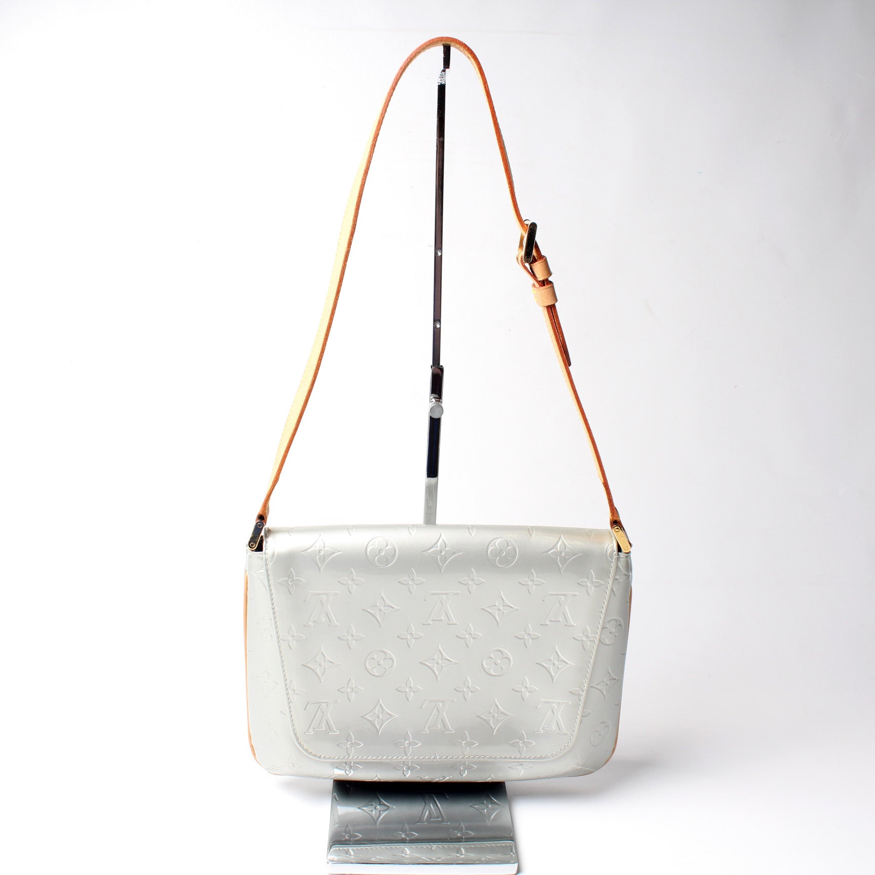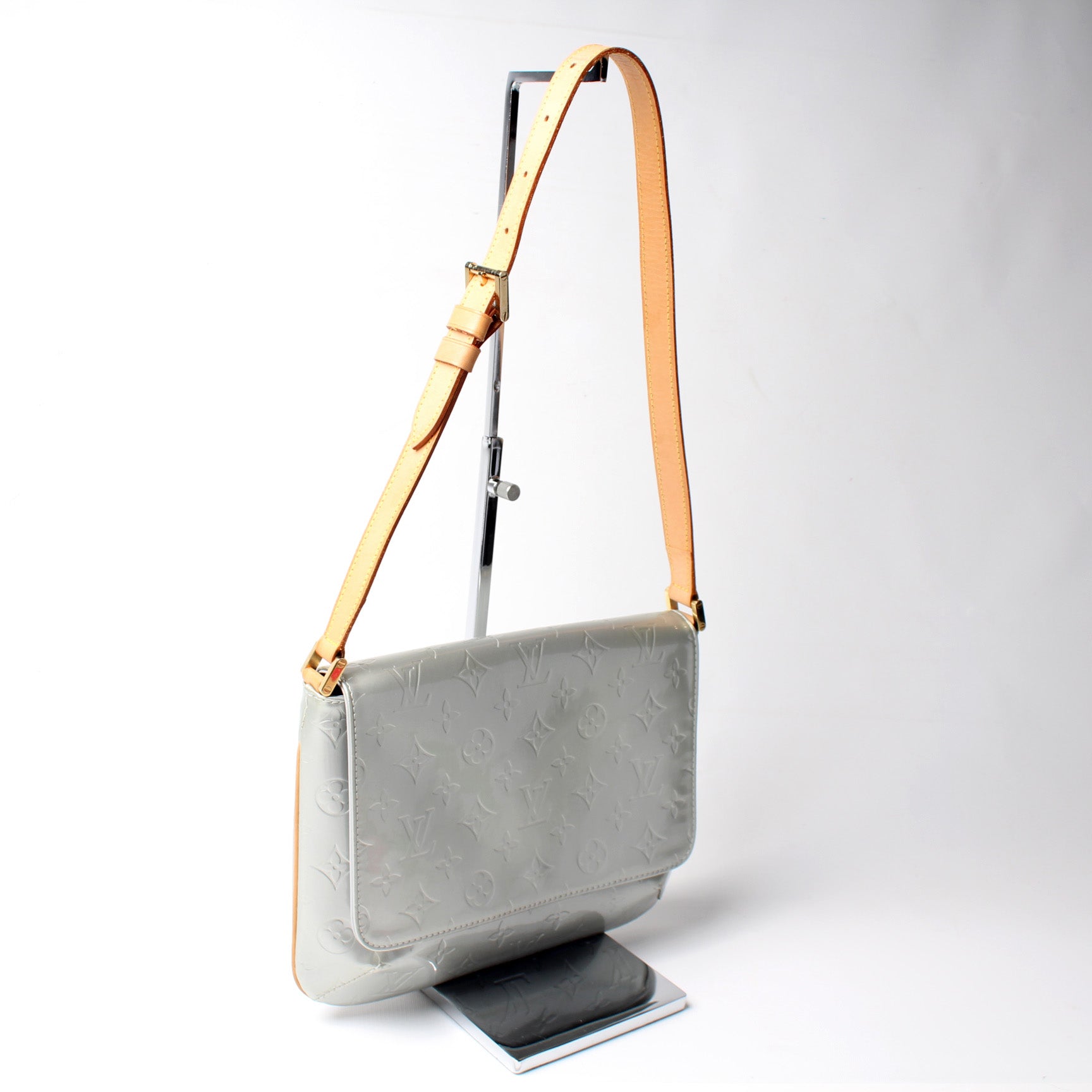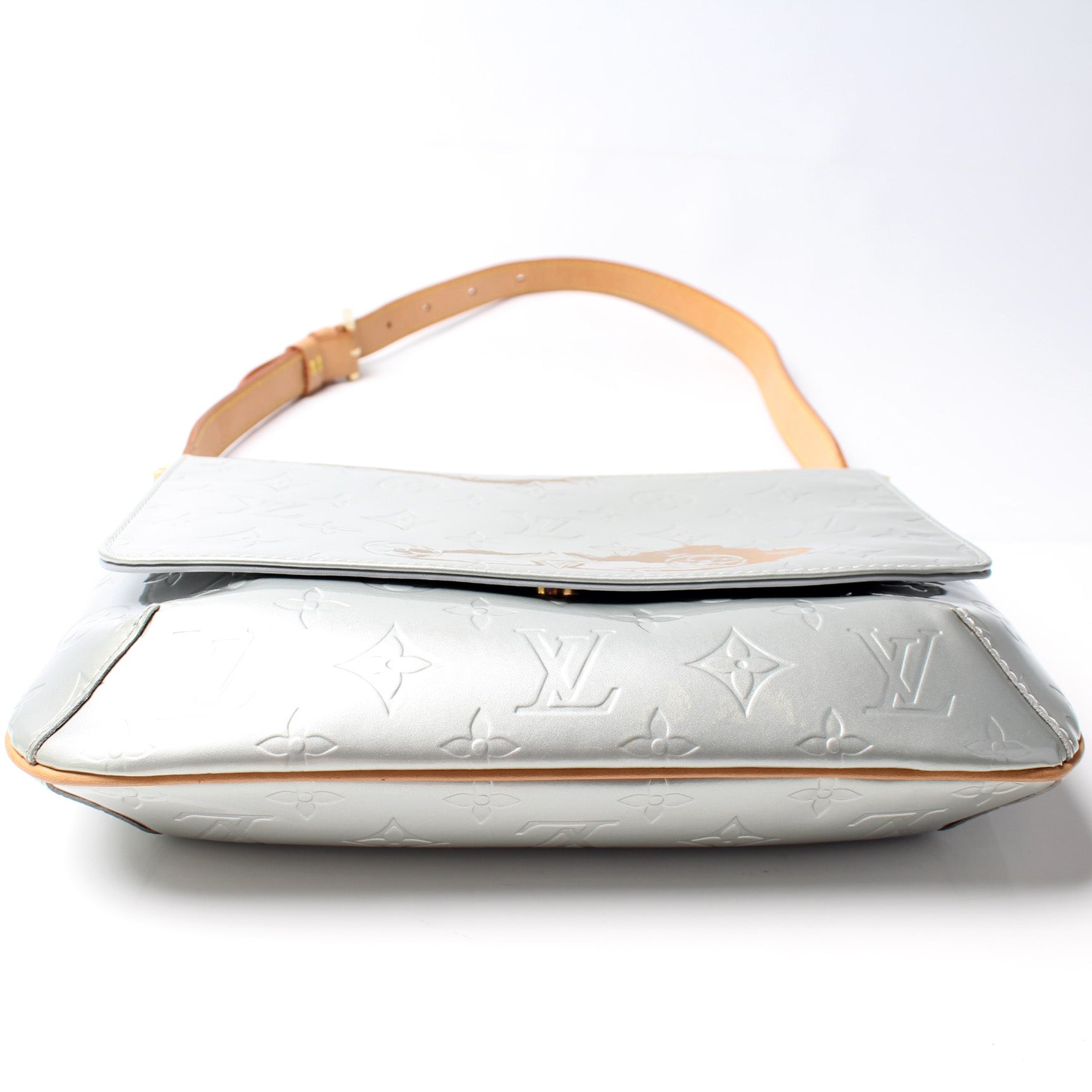 Exterior: The exterior Vernis leather is free of any rips or cracks. The corners have minimal wear. The leather trim shows light discoloration.Â