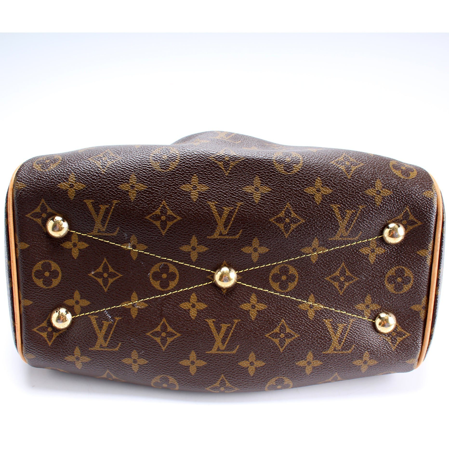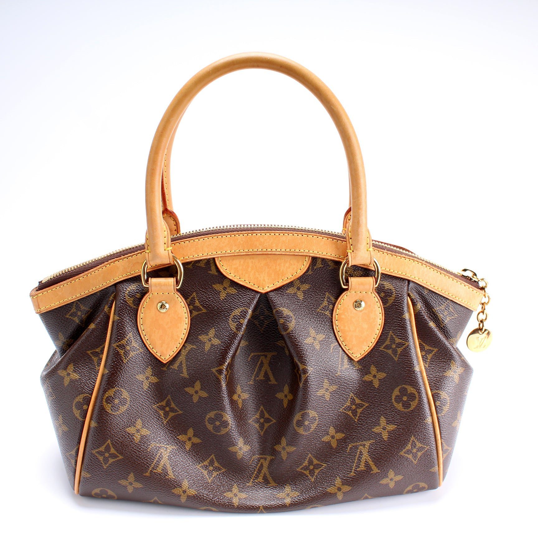 Louis Vuitton Tivoli PM. The exterior is in the classic Louis Vuitton Monogram coated canvas.Â