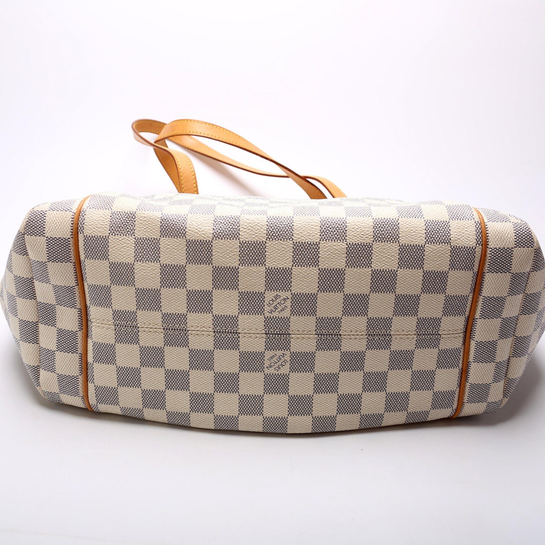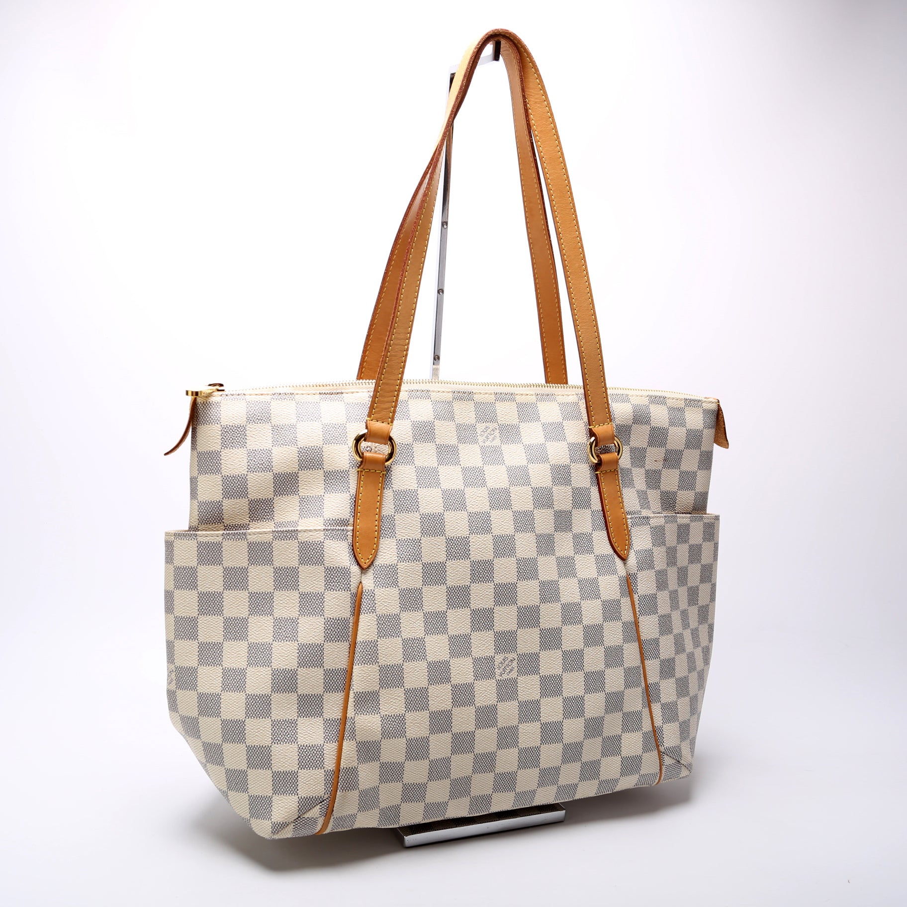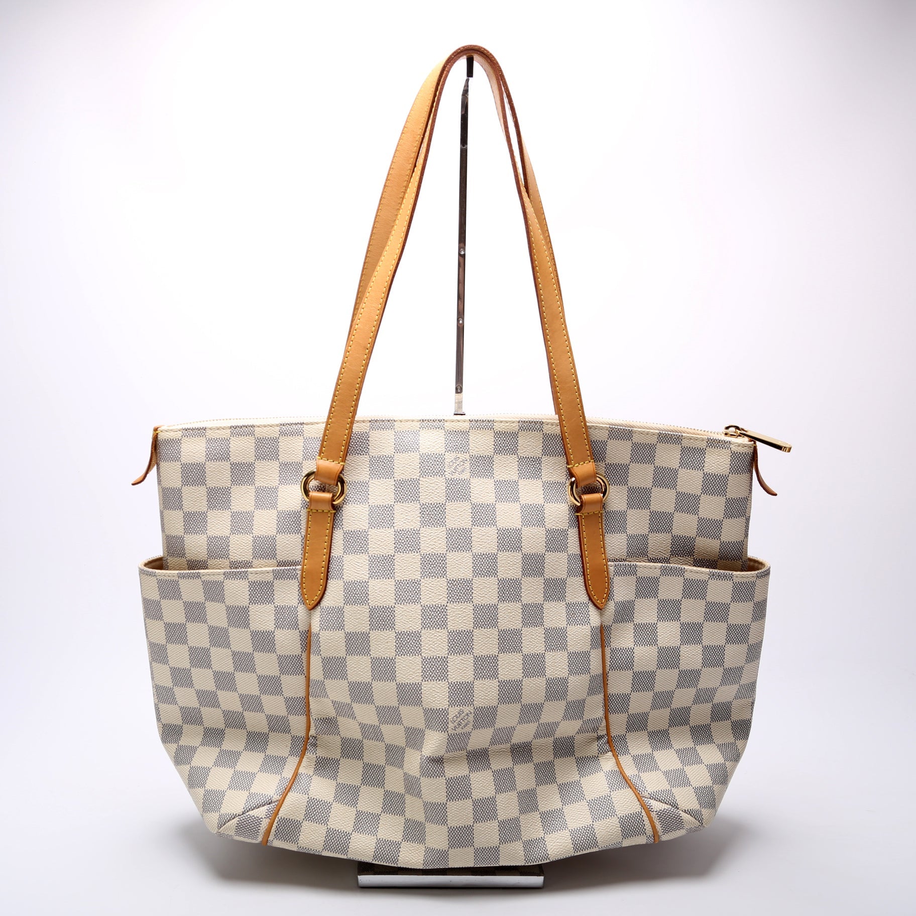 Louis Vuitton Totally MM. The exterior is in the classic Louis Vuitton Damier Azur coated canvas.Â