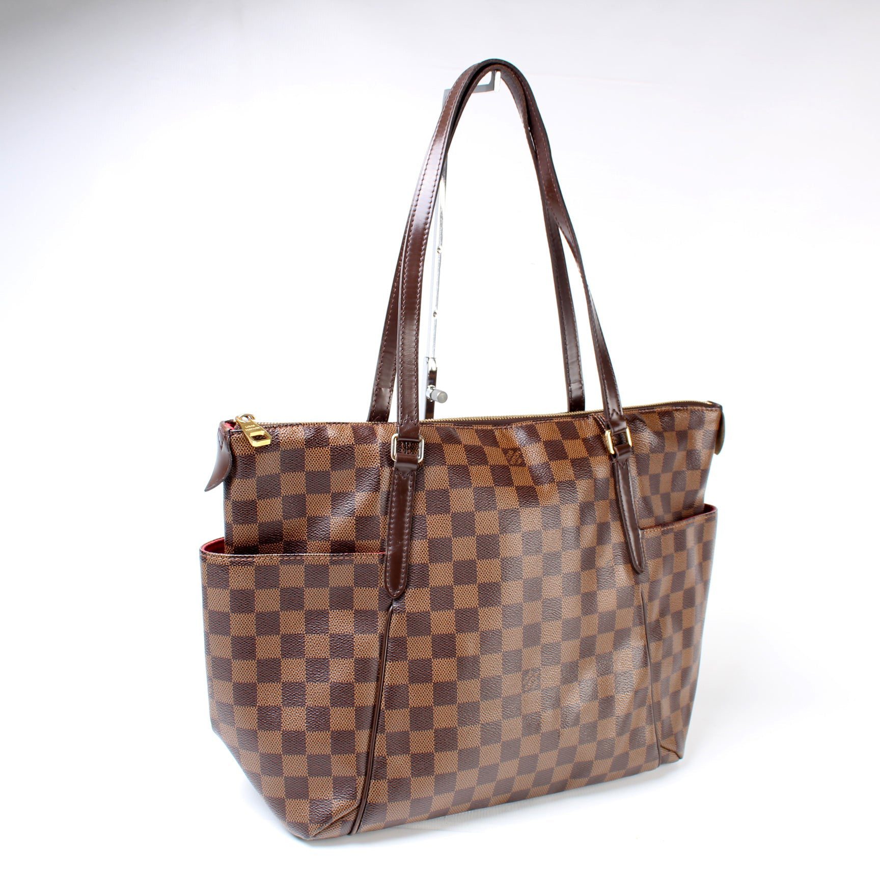 Louis Vuitton Totally MM. The exterior is in the classic Louis Vuitton Damier Ebene coated canvas.