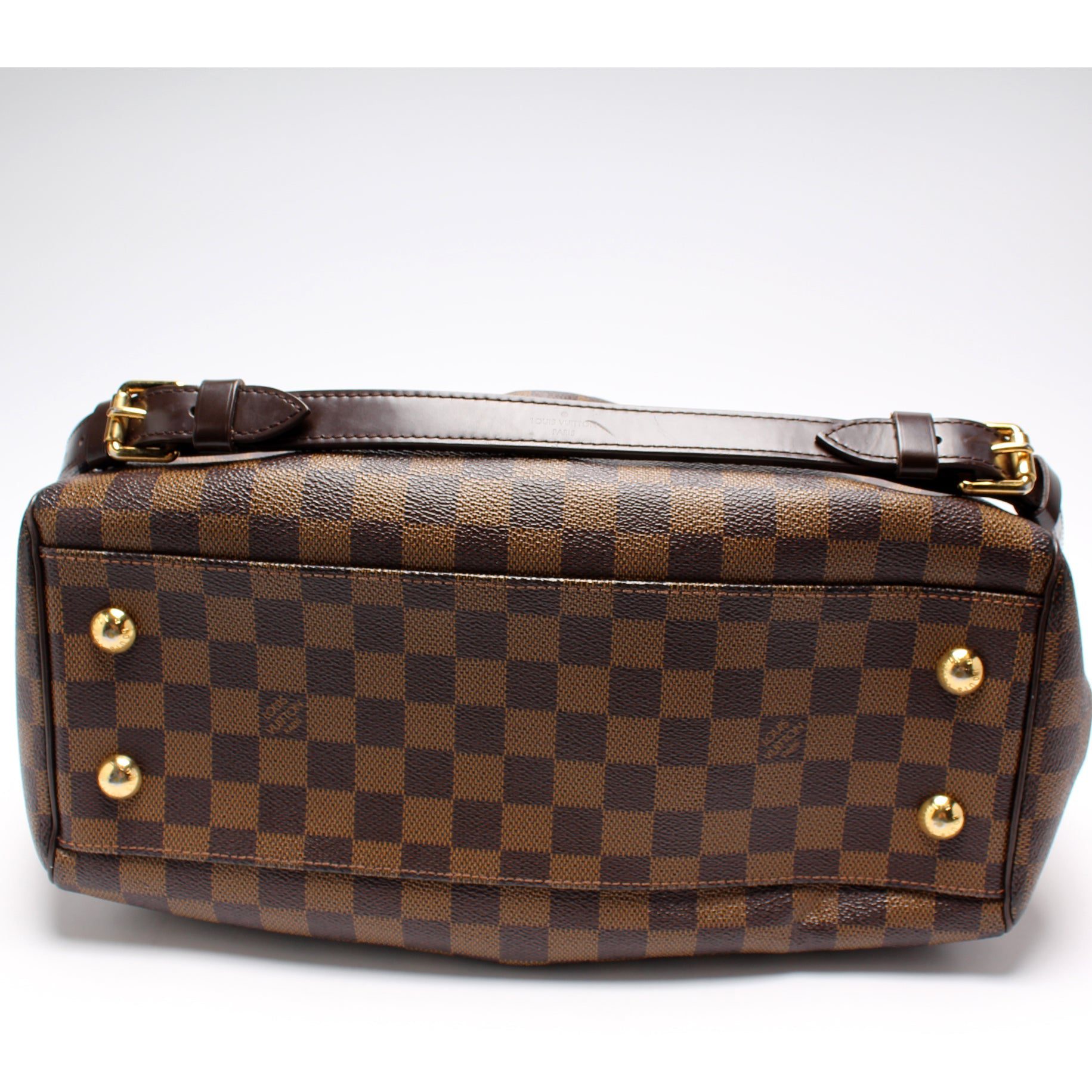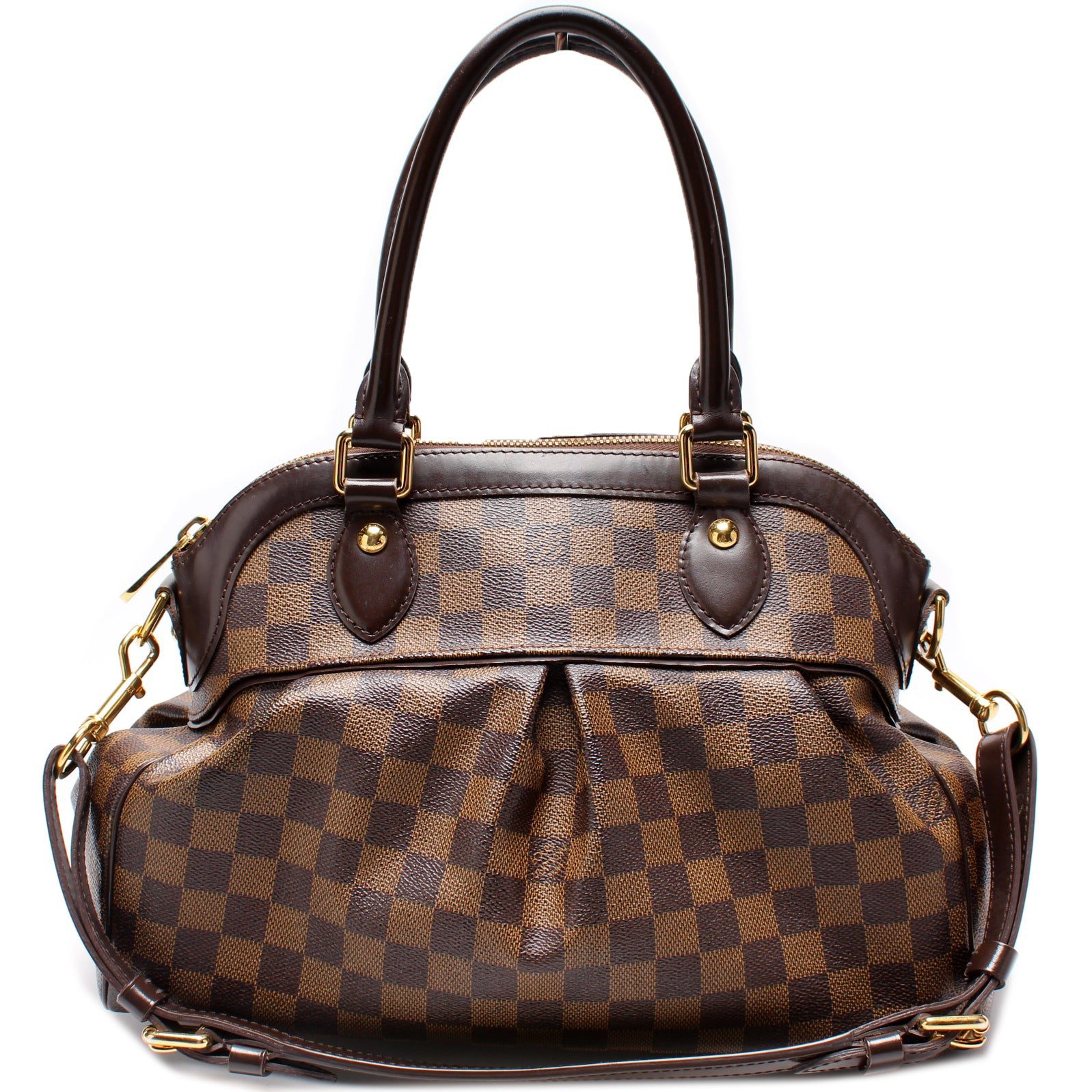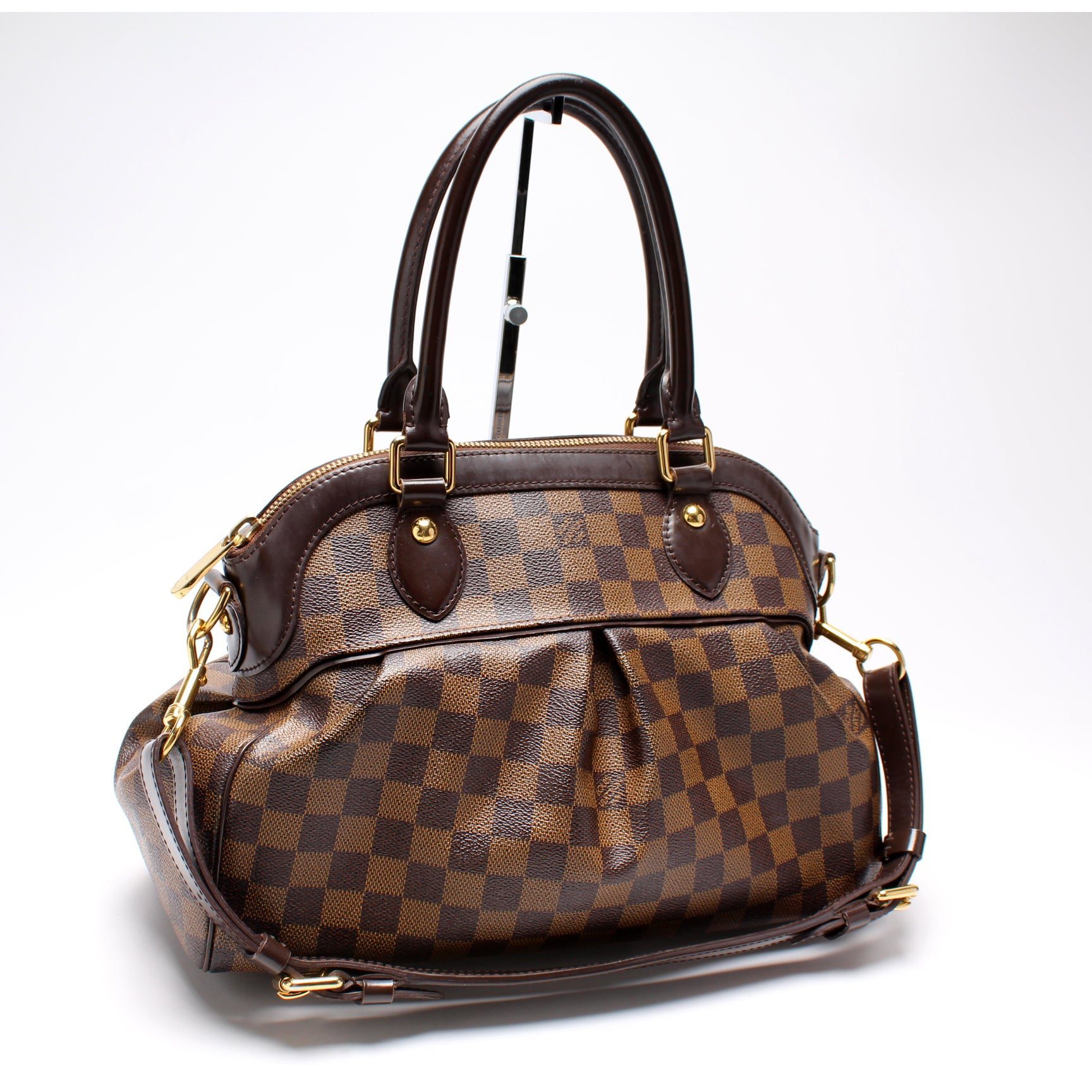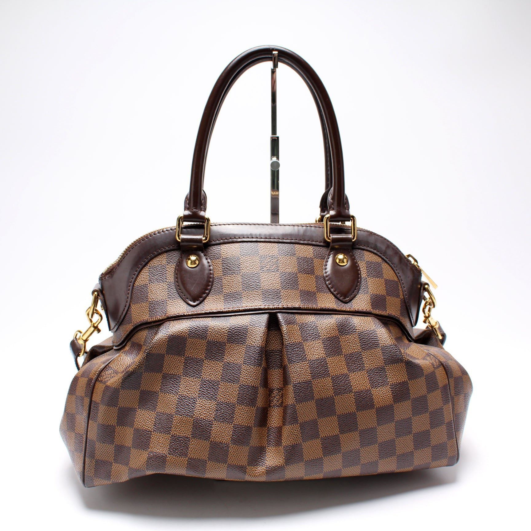Louis Vuitton Trevi GM. The exterior is in the classic Louis Vuitton Damier Ebene coated canvas.Â