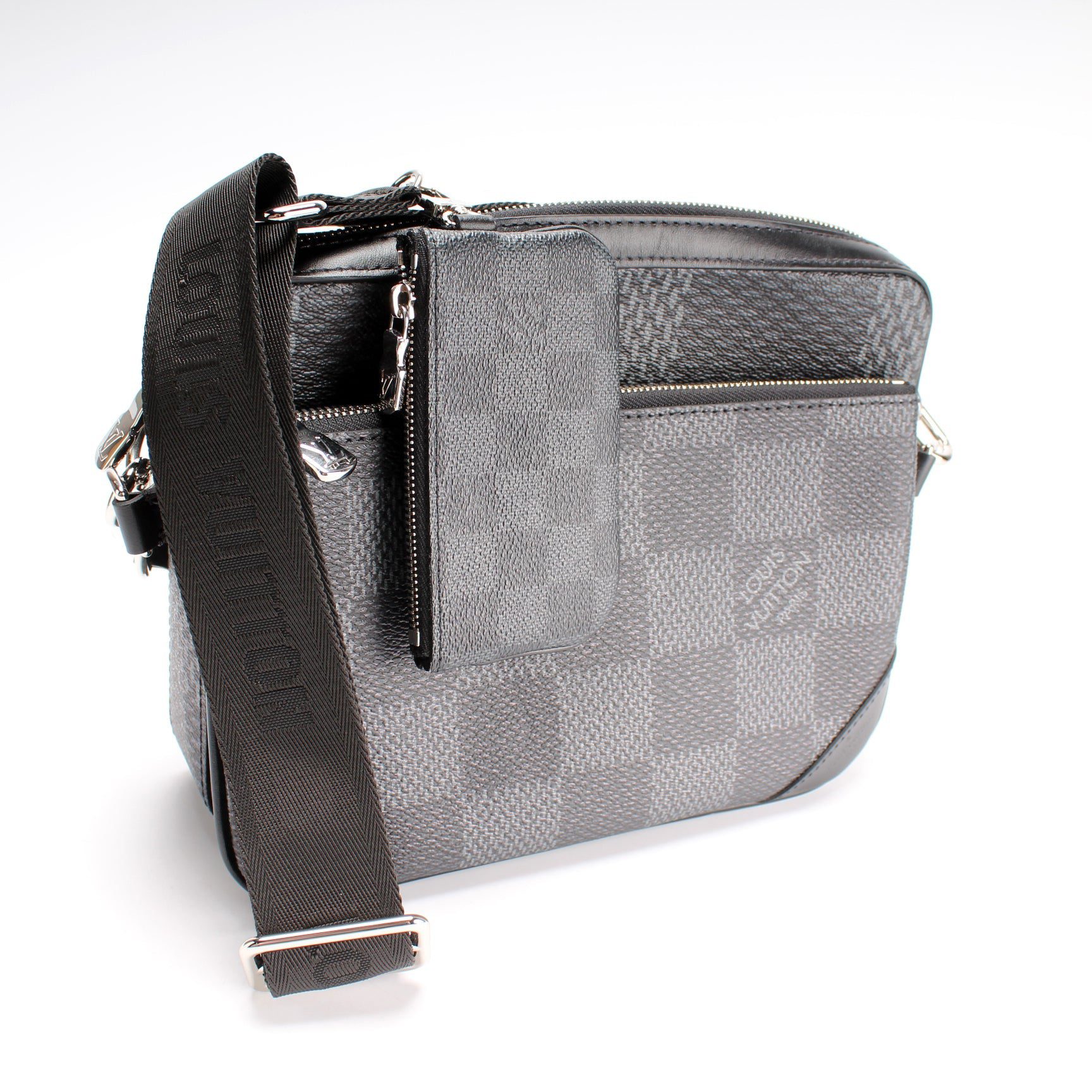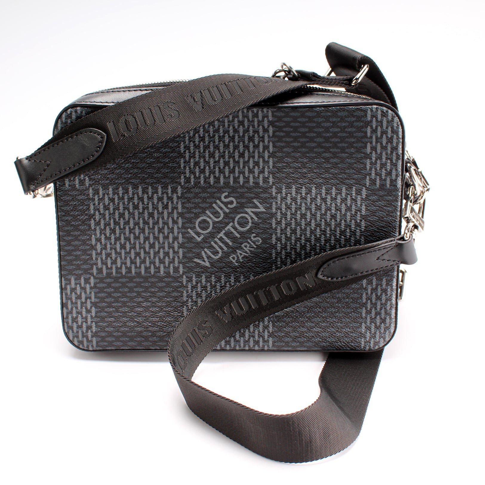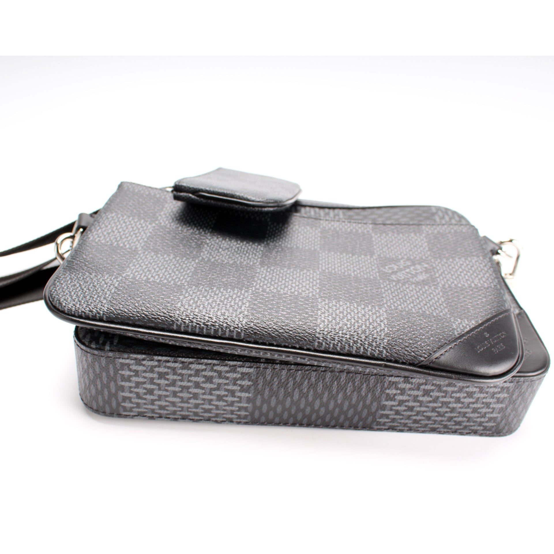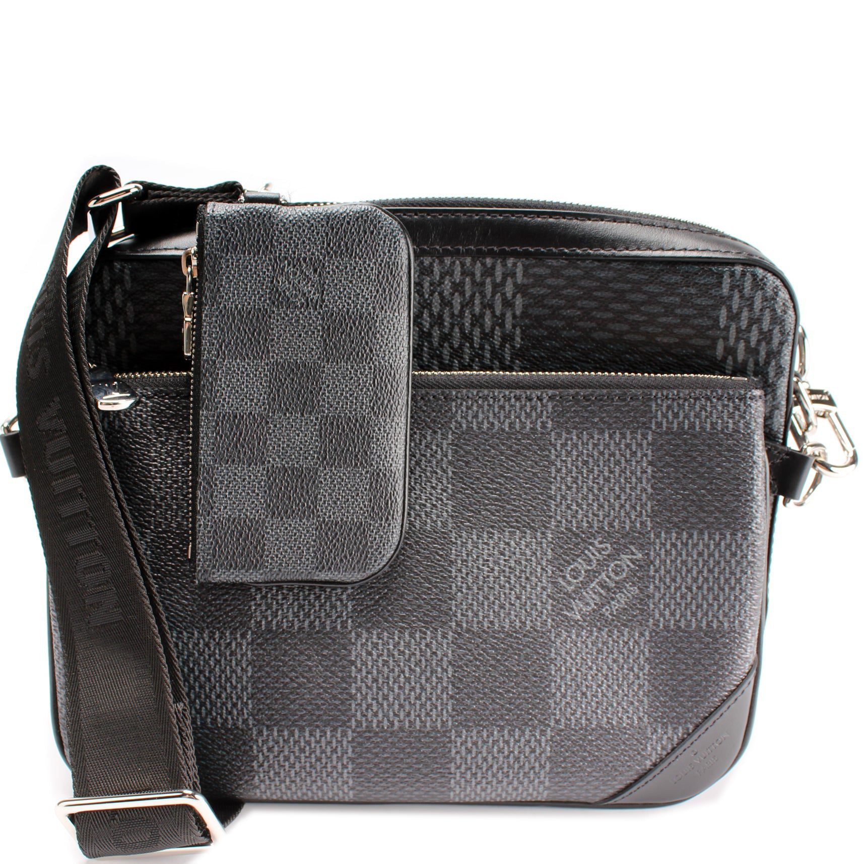 Louis Vuitton Trio Messenger. The exterior is in the classic Louis Vuitton Damier Graphite coated canvas.Â