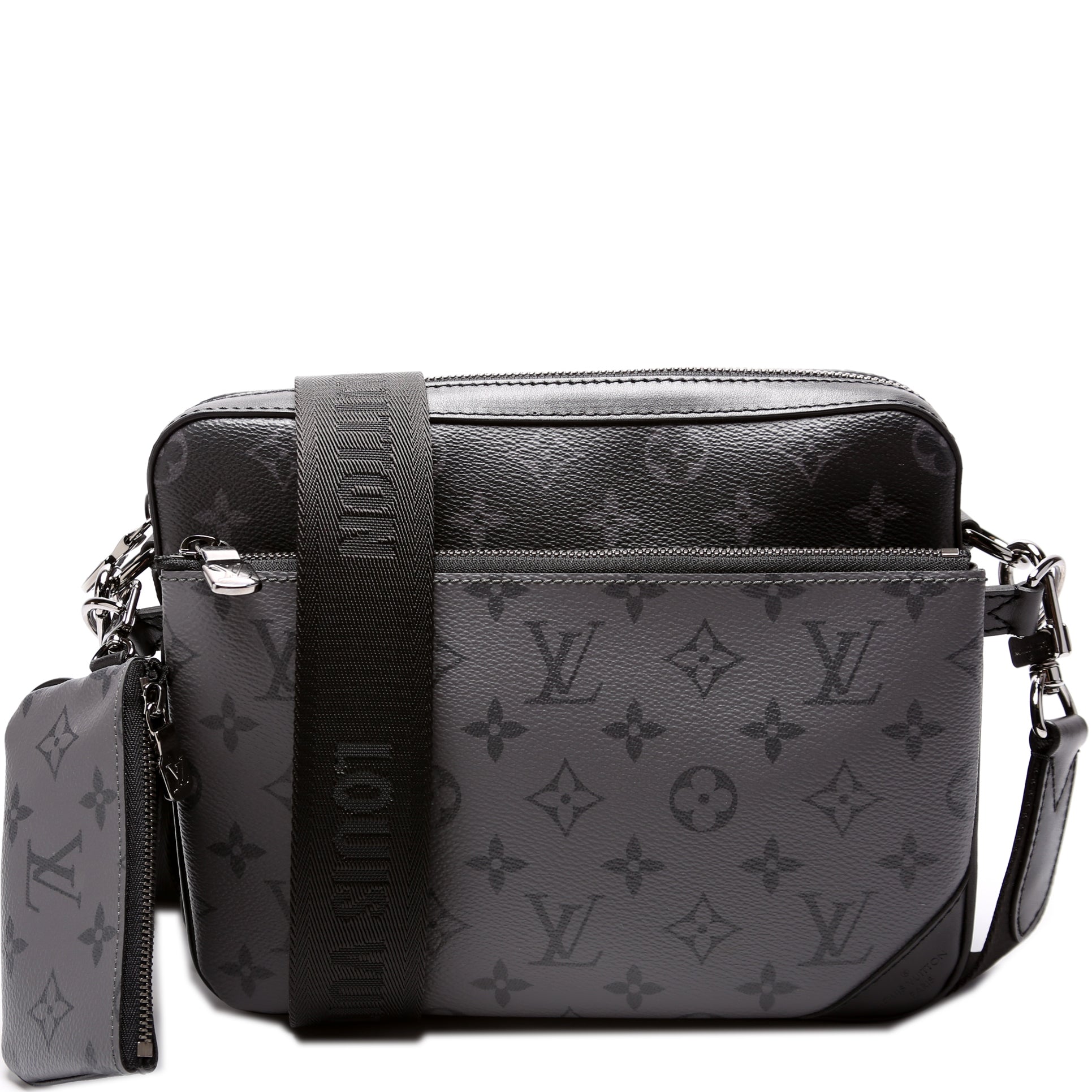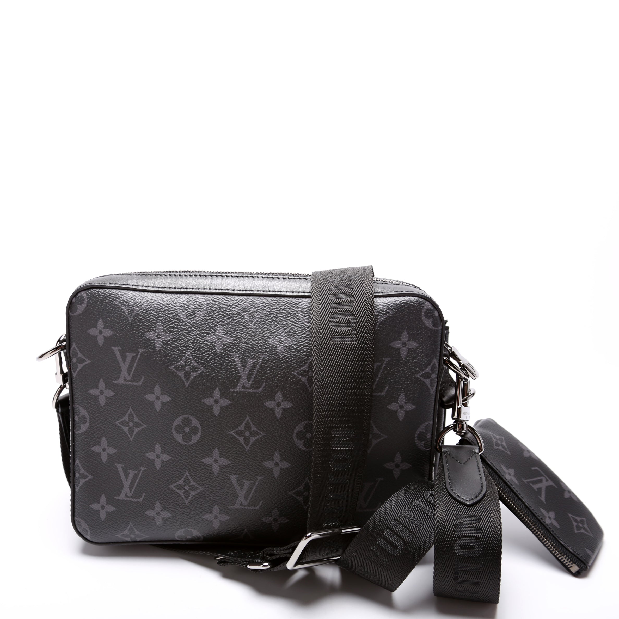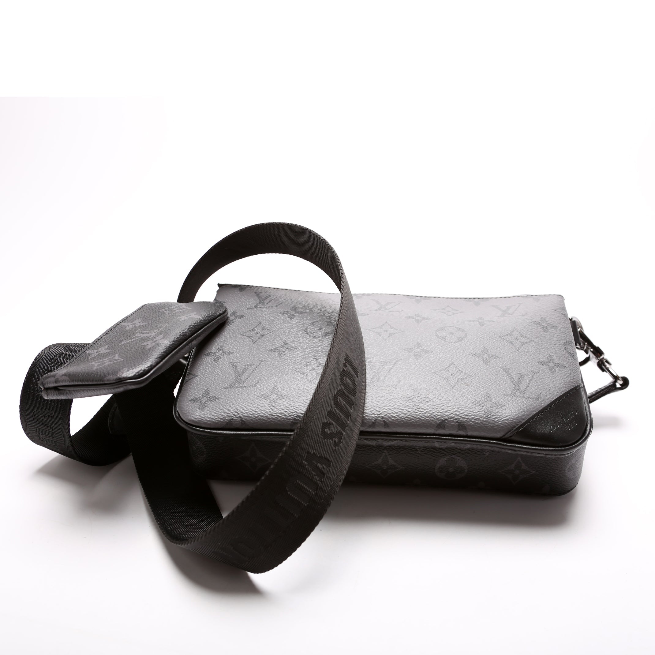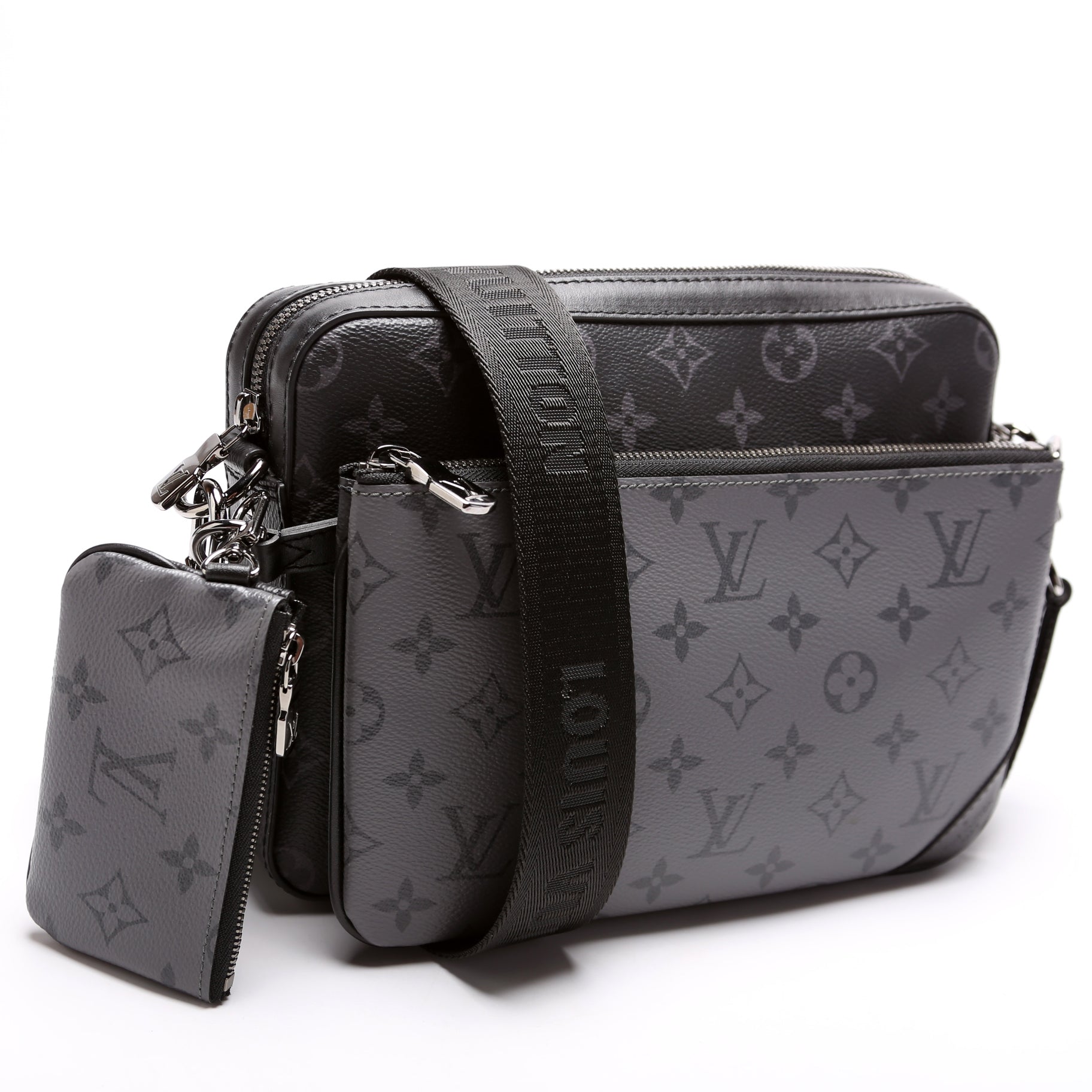 Louis Vuitton Trio Messenger. The exterior is in the classic Louis Vuitton Eclipse Monogram Reverse coated canvas.Â